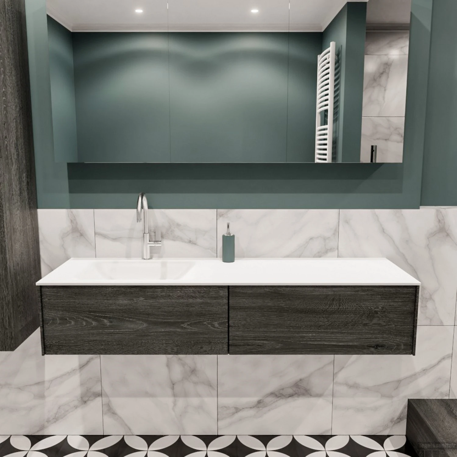 Bovenop de onderkast bevestigt u de inbouw wastafel. Deze wastafel is wit van kleur en is gemaakt van solid surface. Solid surface is uitstekend geschikt om sanitaire producten van te maken omdat het geen poriën en naden heeft. Solid Surface is een composiet, geproduceerd uit mineralen en harsen. Bovendien is dit materiaal bestendig tegen vocht, vlekken, en zelfs chemische stoffen. Er trekt dus niets in, het is niet poreus, heeft een intense kleur én is gemakkelijk schoon te houden. De wasbak op deze wastafel bevindt zich aan de linkerzijde van het blad.