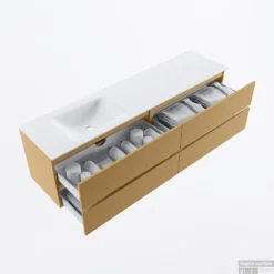 Bovenop de onderkast bevestigt u de inbouw wastafel. Deze wastafel is wit van kleur en is gemaakt van solid surface. Solid surface is uitstekend geschikt om sanitaire producten van te maken omdat het geen poriën en naden heeft. Solid Surface is een composiet, geproduceerd uit mineralen en harsen. Bovendien is dit materiaal bestendig tegen vocht, vlekken, en zelfs chemische stoffen. Er trekt dus niets in, het is niet poreus, heeft een intense kleur én is gemakkelijk schoon te houden.