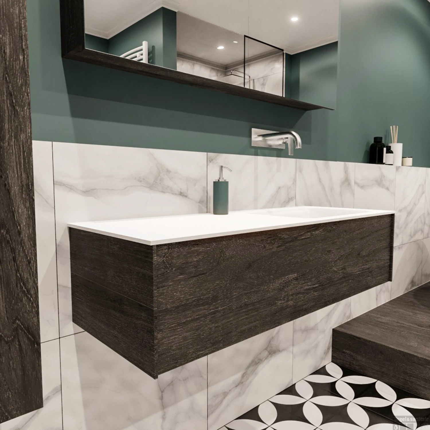 Bovenop de onderkast bevestigt u de inbouw wastafel. Deze wastafel is wit van kleur en is gemaakt van solid surface. Solid surface is uitstekend geschikt om sanitaire producten van te maken omdat het geen poriën en naden heeft. Solid Surface is een composiet, geproduceerd uit mineralen en harsen. Bovendien is dit materiaal bestendig tegen vocht, vlekken, en zelfs chemische stoffen. Er trekt dus niets in, het is niet poreus, heeft een intense kleur én is gemakkelijk schoon te houden.