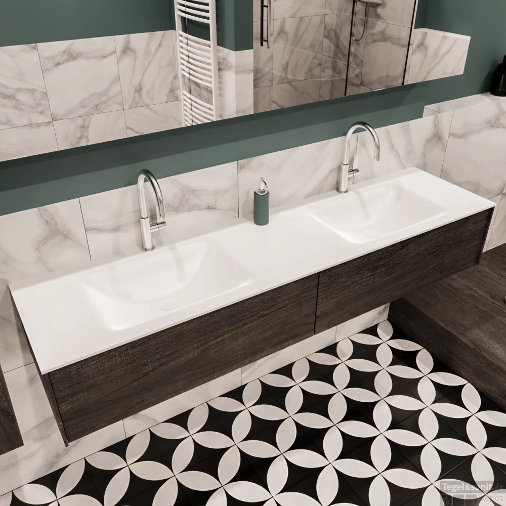Bovenop de onderkast bevestigt u de dubbele inbouw wastafel. Deze dubbele wastafel is wit van kleur en is gemaakt van solid surface. Solid surface is uitstekend geschikt om sanitaire producten van te maken omdat het geen poriën en naden heeft. Solid Surface is een composiet, geproduceerd uit mineralen en harsen. Bovendien is dit materiaal bestendig tegen vocht, vlekken, en zelfs chemische stoffen. Er trekt dus niets in, het is niet poreus, heeft een intense kleur én is gemakkelijk schoon te houden.