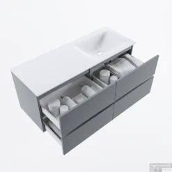 Bovenop de onderkast bevestigt u de inbouw wastafel. Deze wastafel is wit van kleur en is gemaakt van solid surface. Solid surface is uitstekend geschikt om sanitaire producten van te maken omdat het geen poriën en naden heeft. Solid Surface is een composiet, geproduceerd uit mineralen en harsen. Bovendien is dit materiaal bestendig tegen vocht, vlekken, en zelfs chemische stoffen. Er trekt dus niets in, het is niet poreus, heeft een intense kleur én is gemakkelijk schoon te houden.