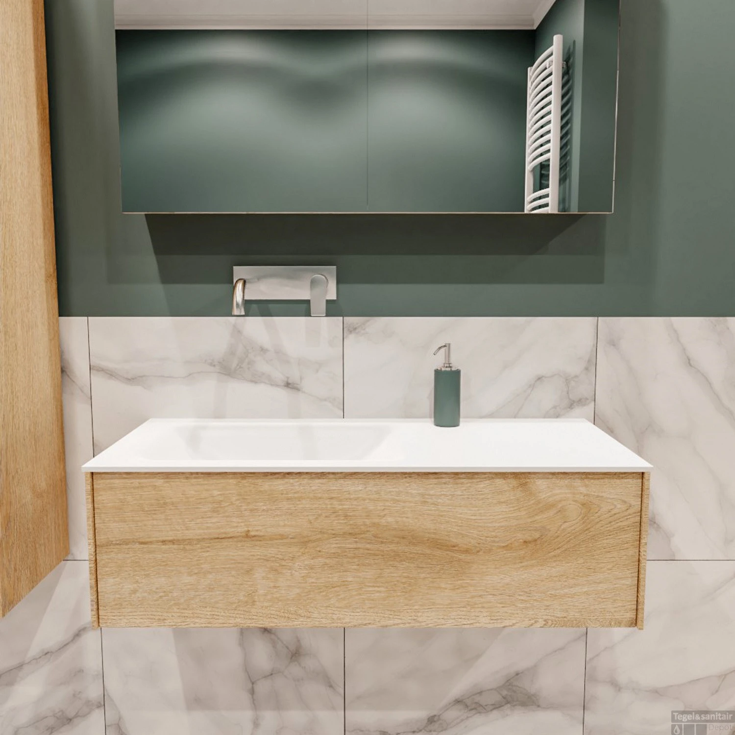 Badkamermeubel BWS Madrid Washed Oak 100x45x30 cm Mat Witte Solid Surface Wastafel Links (0 kraangaten)