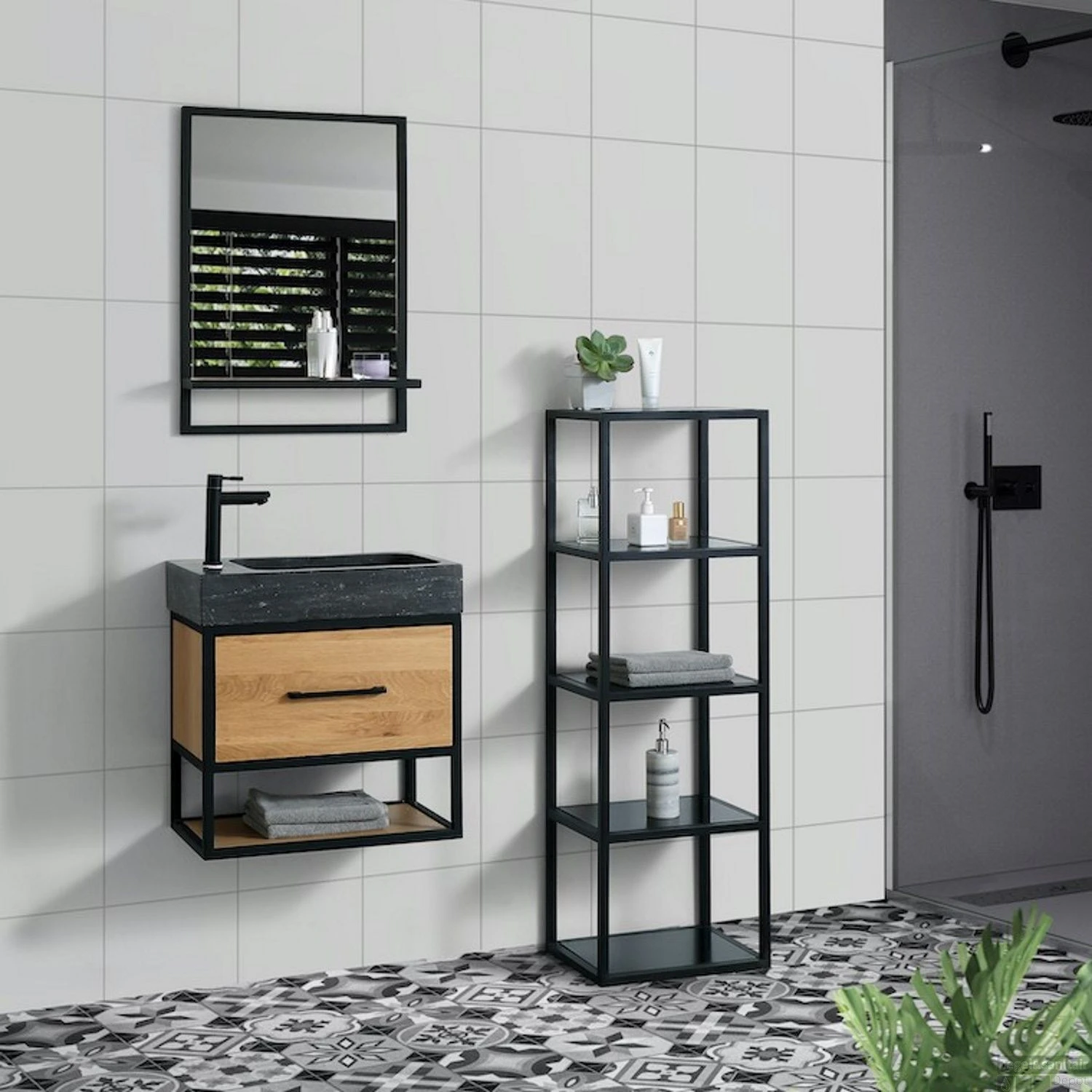 Het badmeubel heeft een breedte van 55 cm, een diepte van 32 cm en een hoogte van 46 cm. Onder de softclose lade van het meubel zit een klein plateau waar u bijvoorbeeld uw handdoeken kunt opbergen. De industriële look van het meubel wordt benadrukt door het zwarte RVS frame om het meubel heen en de zwarte greepjes van de lades. Het wastafelblad is gemaakt van natuursteen, waardoor deze uniek zal zijn. We garanderen geen garantie of omruil bij natuurlijke aders, verkleuring, waterafschot en scheurvorming. Overigens geven wij altijd het advies om geen bijtende schoonmaakmiddelen te gebruiken bij natuurstenen materialen.