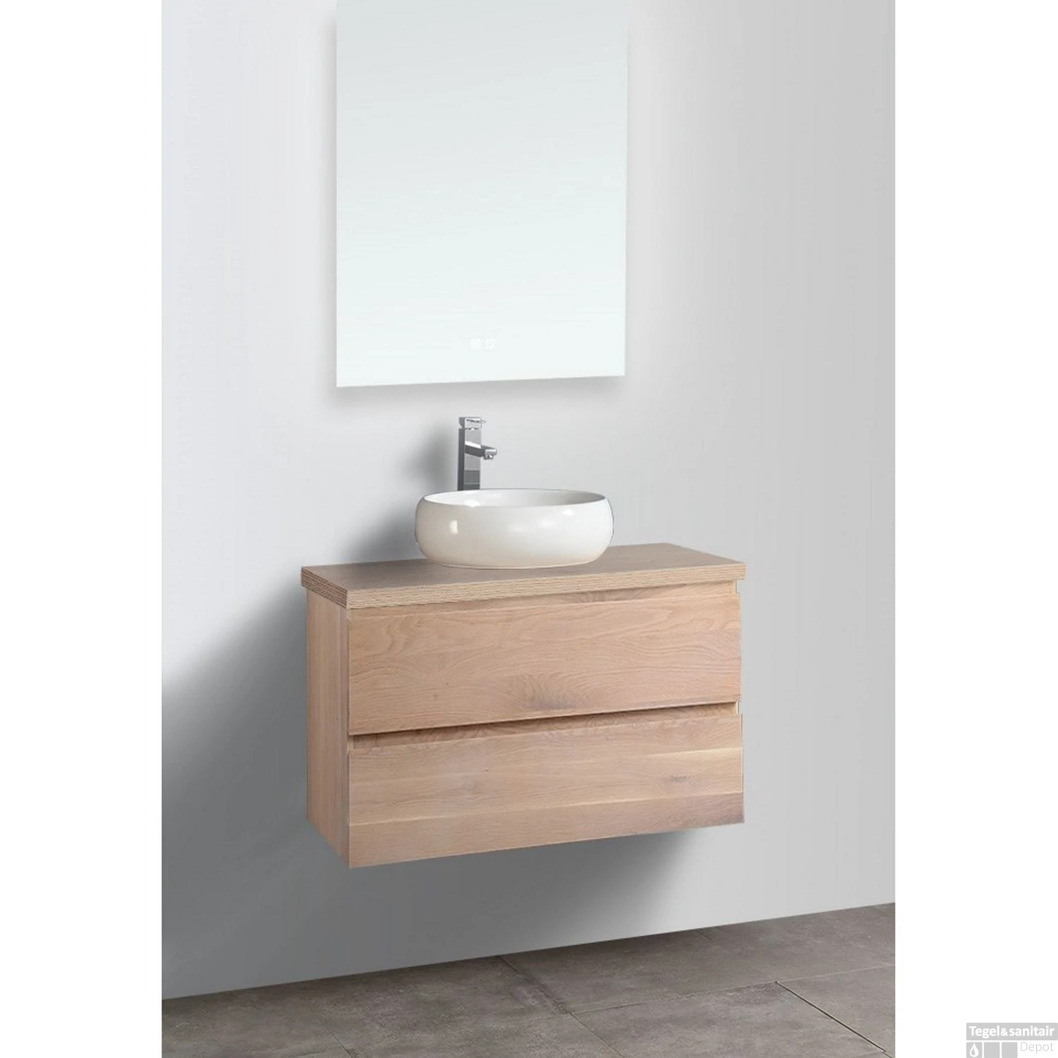 Het badmeubel heeft een breedte van 90 cm, een diepte van 50 cm en een hoogte van 53 cm. De eiken onderkast wordt geleverd met twee softclose ladegeleiders waardoor de lades nooit hard zullen dichtvallen. De strakke look van het meubel worden benadrukt door de greeploze lades. Het badmeubel komt zonder waskom.