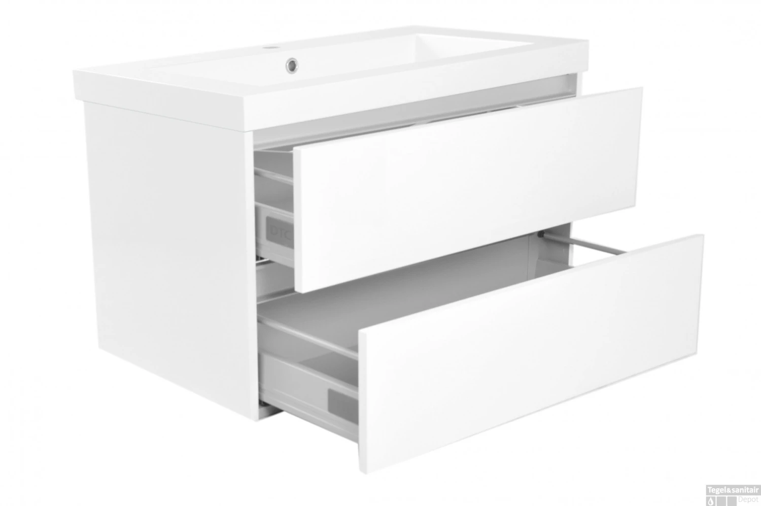 Prachtige badkamermeubelset om uw interieur die finishing touch te geven die u nodig heeft. Met zijn strakke design en prachtige kleur past deze badmeubel in elke badkamer. Bij deze badmeubel heeft u ook een DTC lade-systeem, dit zorgt ervoor dat de laden altijd goed open en dicht zullen schuiven. De lades zijn 18mm dik en de Corpus is 16mm dik.Â