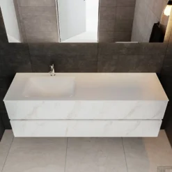 Badkamermeubel BWS Valencia Carrara Mat 150 Cm Solid Surface Wastafel Links (1 Kraangat, 2 Lades)
