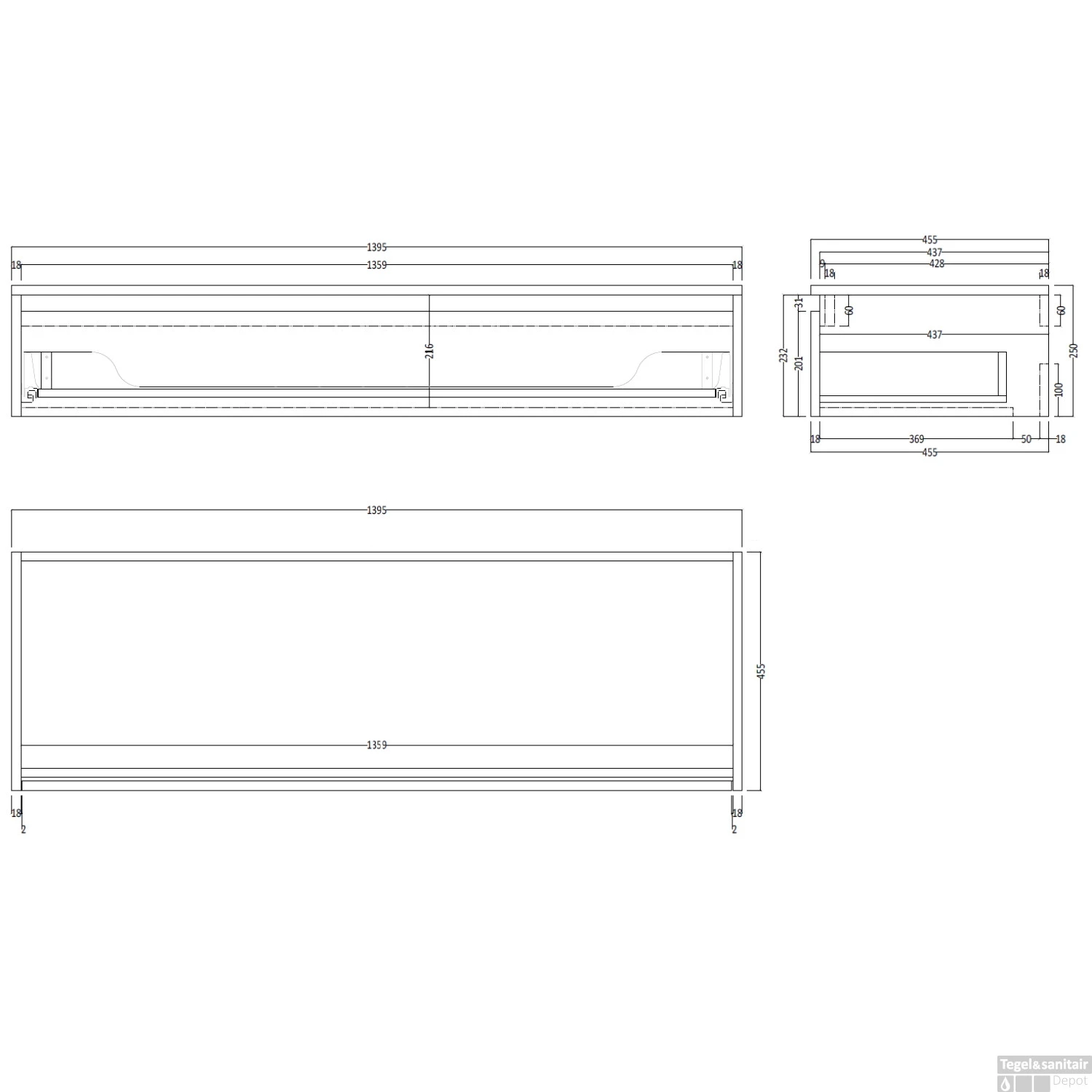 Het wastafelmeubel is uitgevoerd in de kleur mat zwart, een stijlvolle donker bewerkte eikenkleur. De afmetingen zijn 140 cm breed, 45 cm diep en 25 cm hoog.