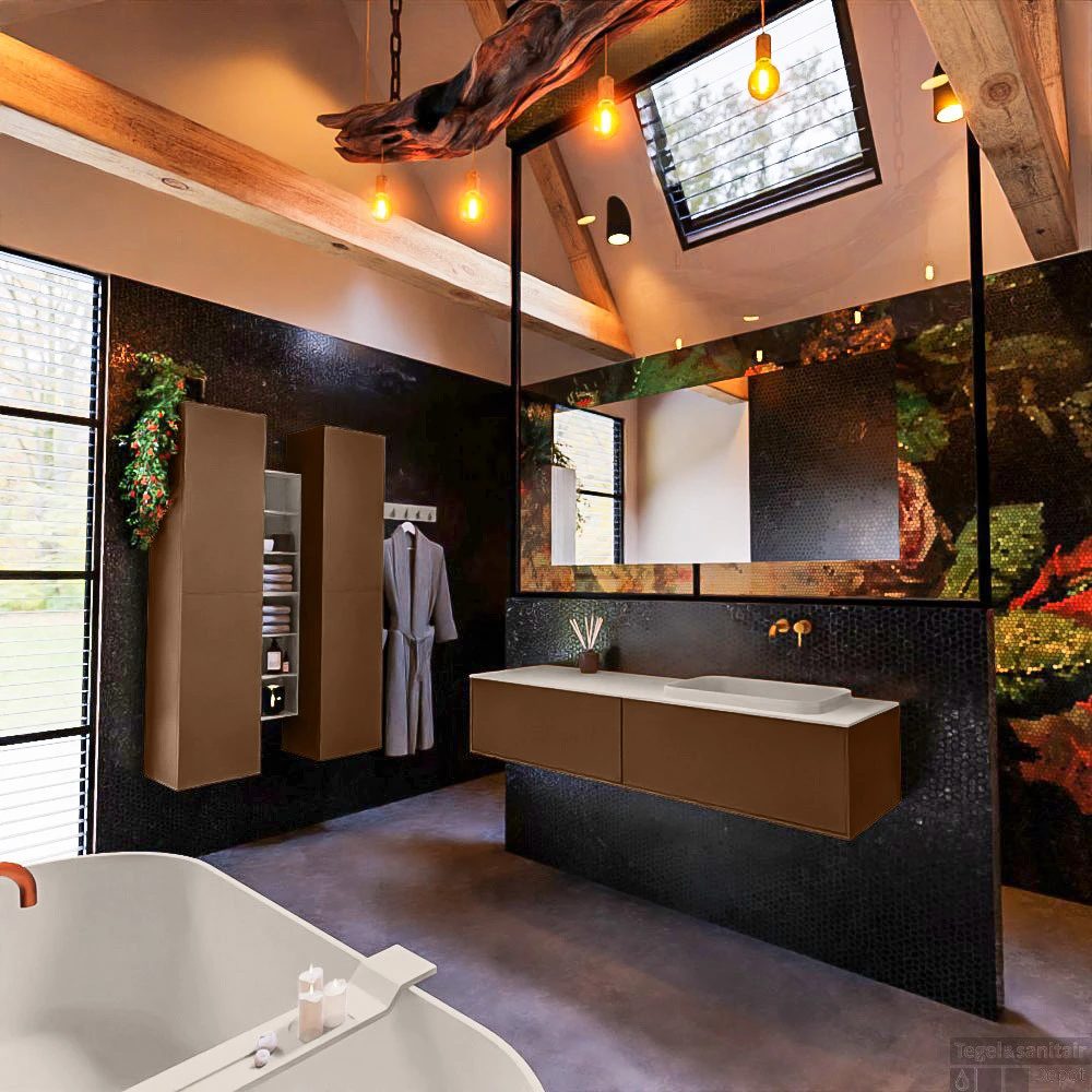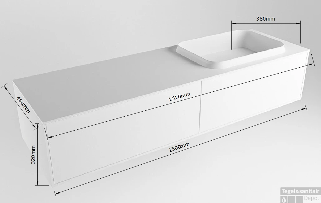De inleg wastafel heeft een opstaande rand met een extra grote en diepe waskom. De ronde vormen van de waskom stralen een luxe zachtheid uit. De plek van de wastafelkraan op de hoek van de waskom geeft een extra speels effect. Het badmeubel van de set ERIN heeft een push to open lade. Zo heeft het badmeubel een mooie en gestroomlijnde uitstraling passend voor in elke badkamerstijl. Het badmeubel op deze afbeeldingen is de ERIN 150cm met onderkast in de kleur Smag met 1 lade(s). In deze serie hebben wij al meer dan 2500 variaties voor jou samengesteld.