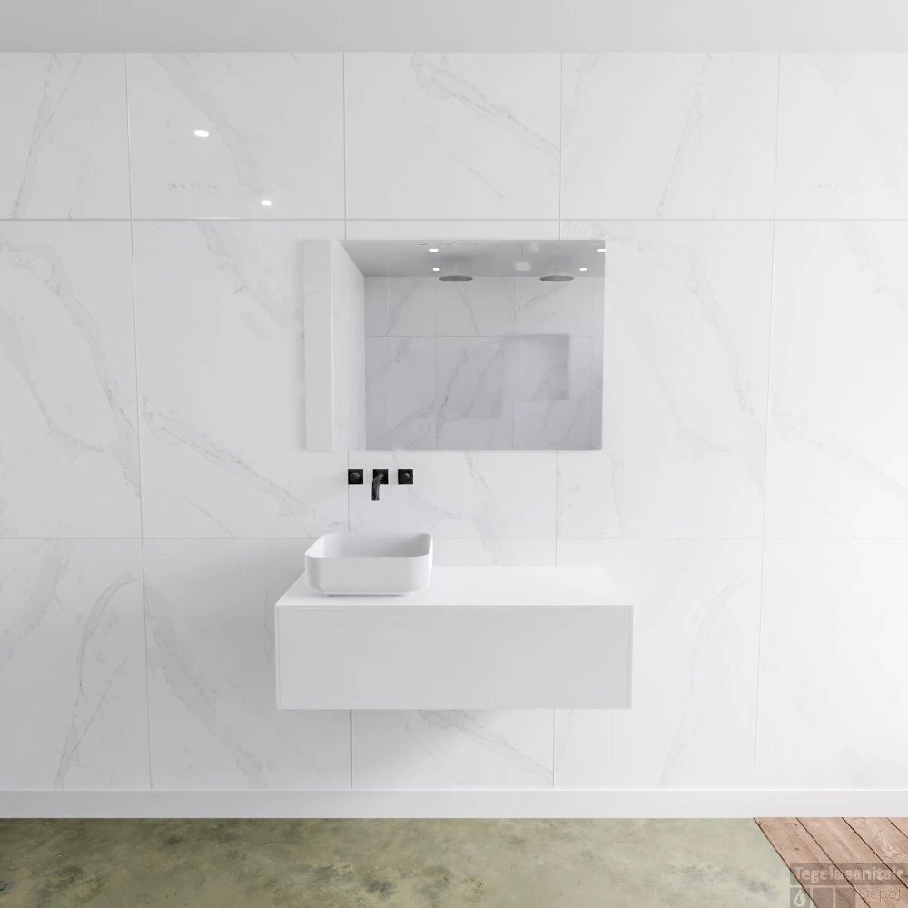 Badkamermeubelset Mondiaz LAGOM 100 cm met Topblad Linkse Wastafel Solid Surface Opzetkom Binx Zonder Kraangaten Mat Wit (1 lade)