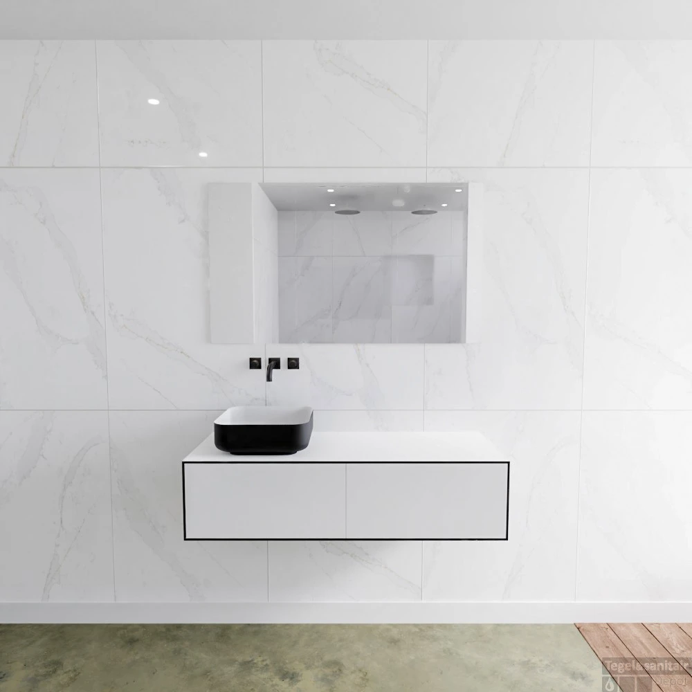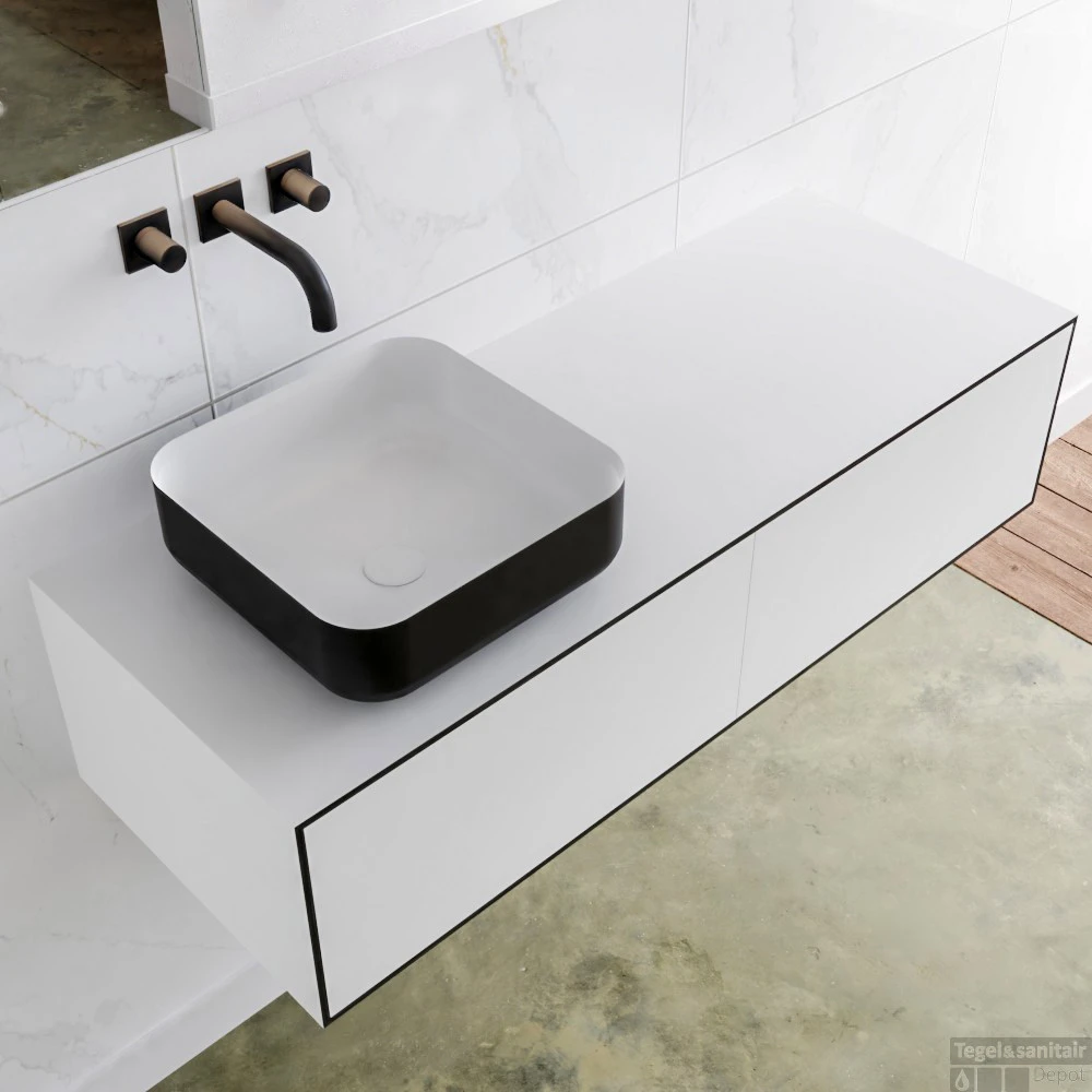 Badkamermeubelset Mondiaz LAGOM 120 cm Topblad met Linkse Wastafel Solid Surface Opzetkom Binx Zonder Kraangaten Mat Zwart (2 laden)