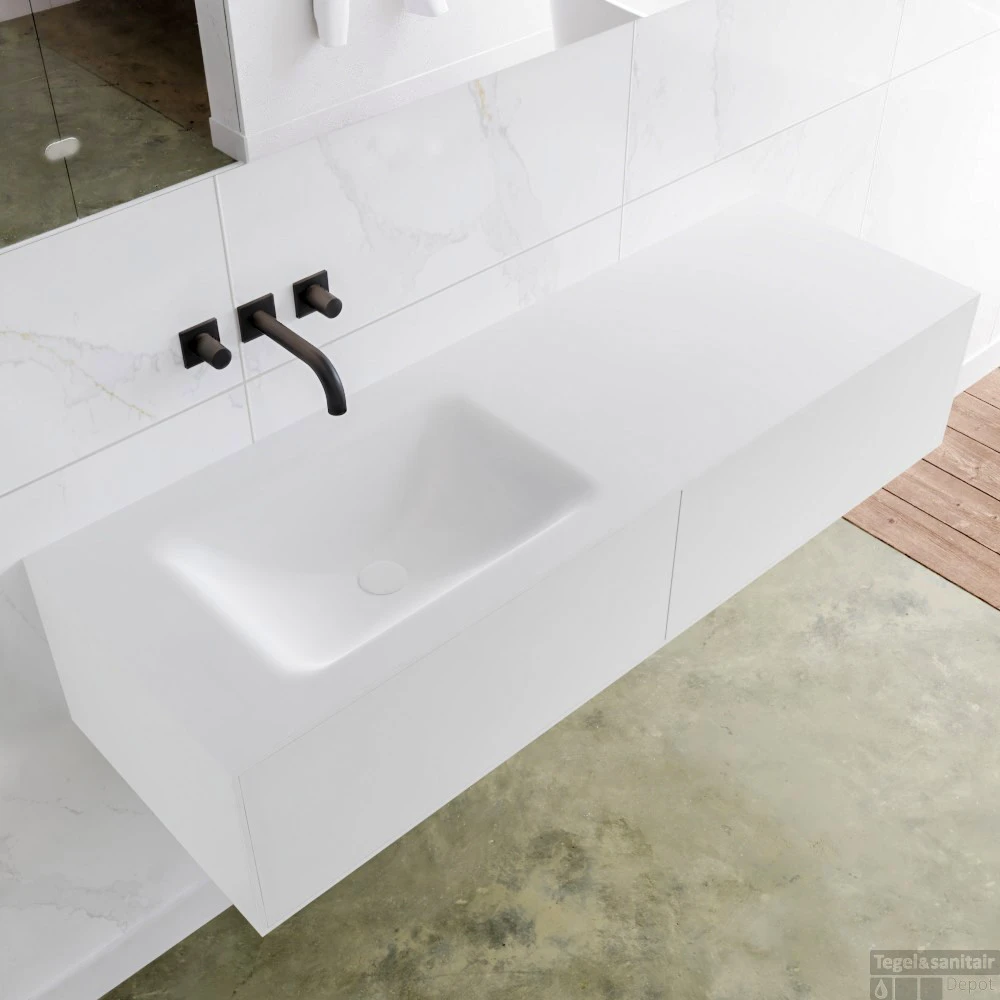 De wastafel heeft een waskom zonder kraangat en is gemaakt van solid surface.