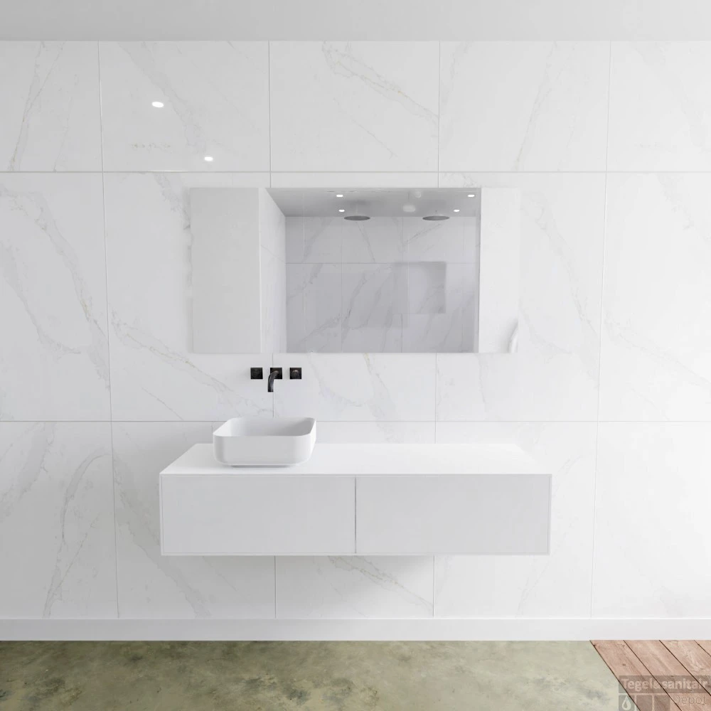 Badkamermeubelset Mondiaz LAGOM 140 cm met Topblad Linkse Wastafel Solid Surface Opzetkom Binx Zonder Kraangaten Mat Wit (2 laden)