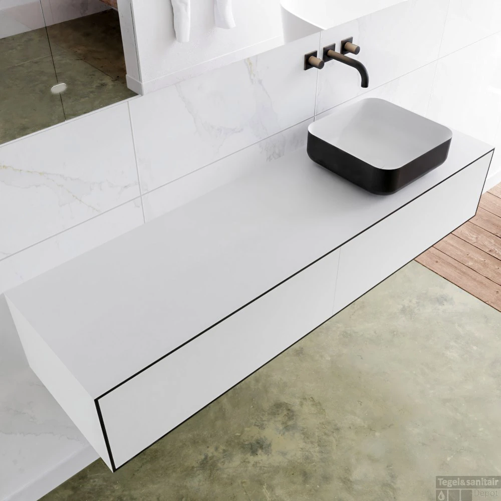 Het hangende badkamermeubel is gemaakt van solid surface. Dit meubel is 160 cm lang en heeft 2 lades die greeploos zijn. De lades kunnen worden geopend met een push-2-open systeem. De panelen zijn naadloos met elkaar verlijmd. Dit zorg voor een strakke en stijlvolle afwerking van uw badkamer.