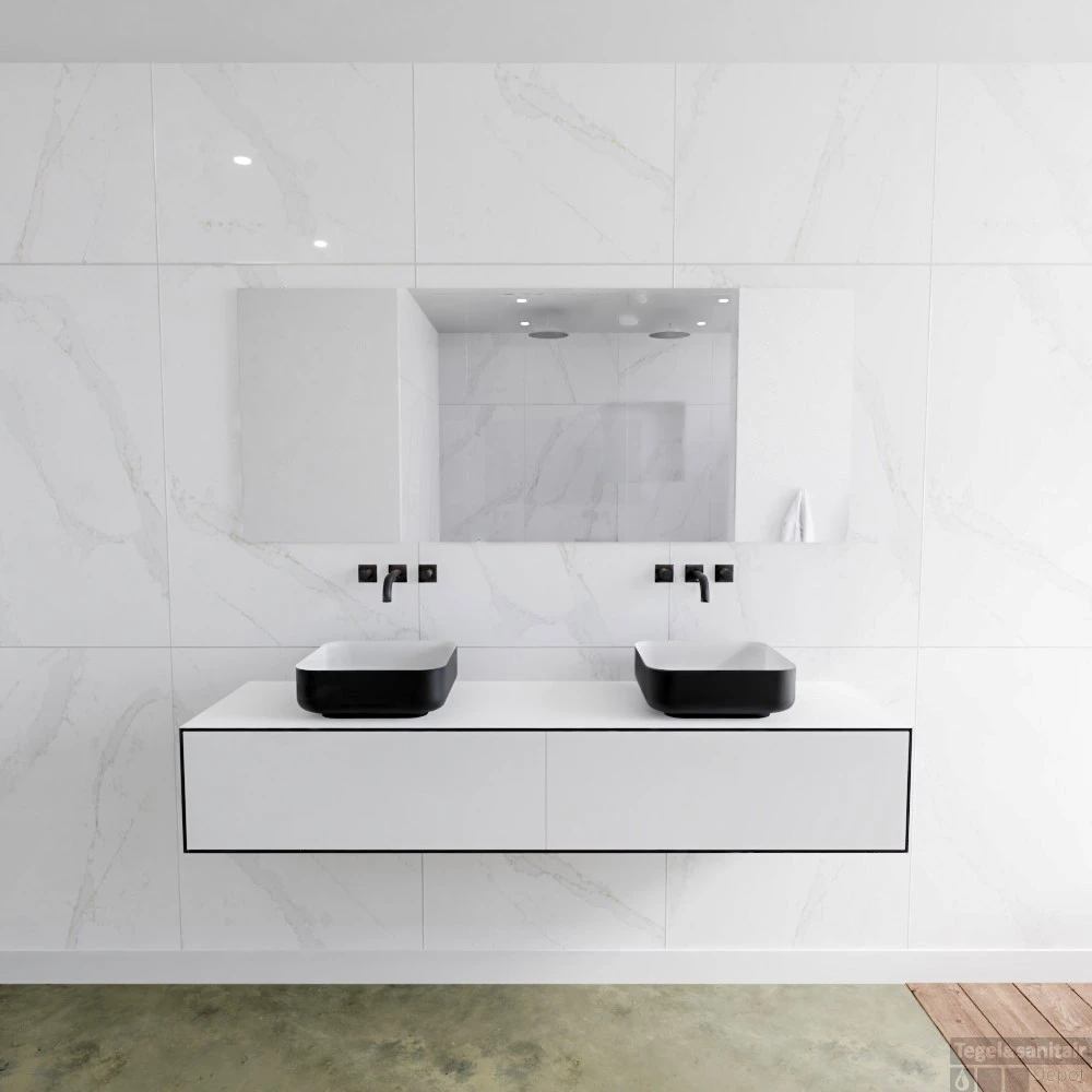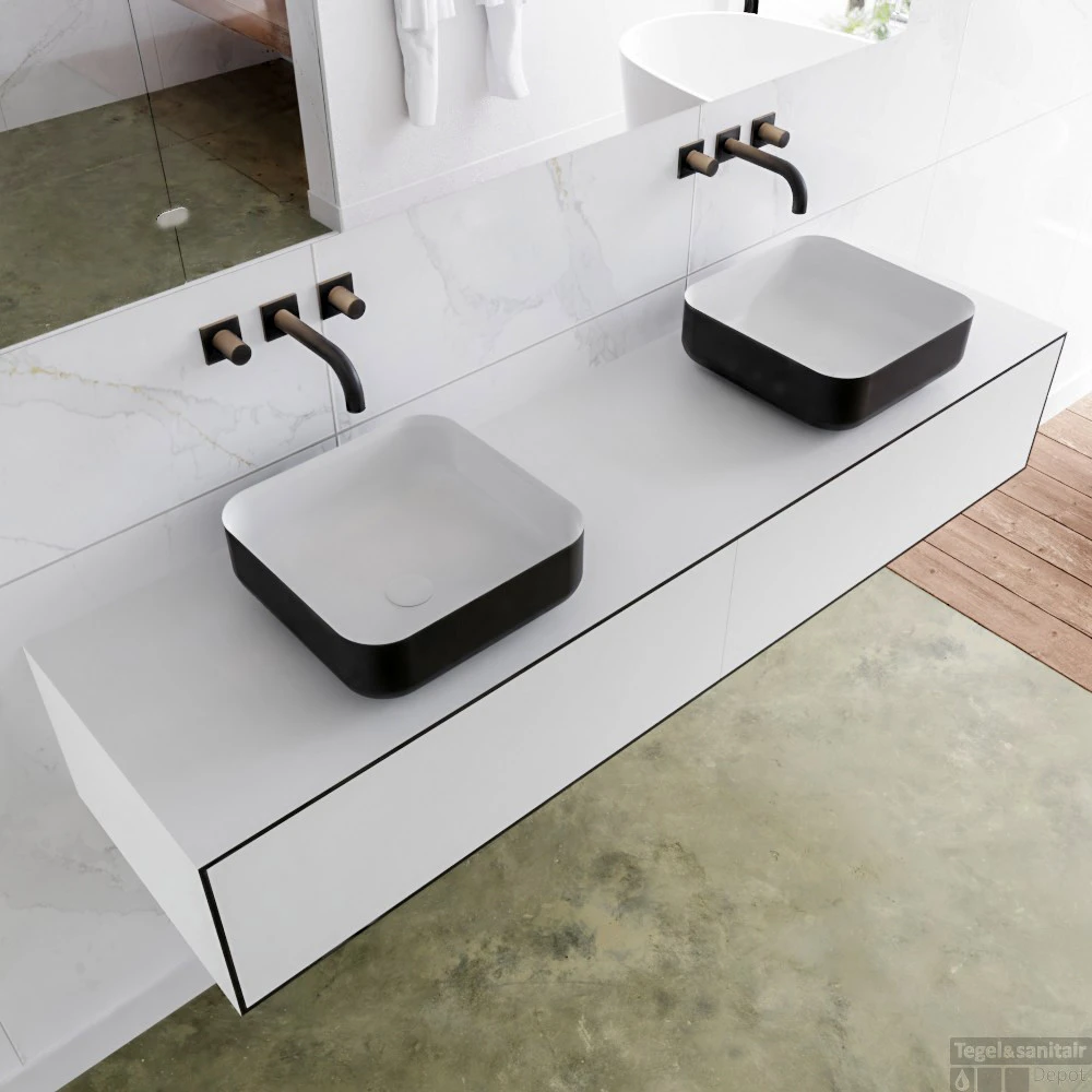 Badkamermeubelset Mondiaz LAGOM 170 cm Topblad met Dubbele Wastafel Solid Surface Opzetkom Binx Zonder Kraangaten Mat Zwart (2 laden)