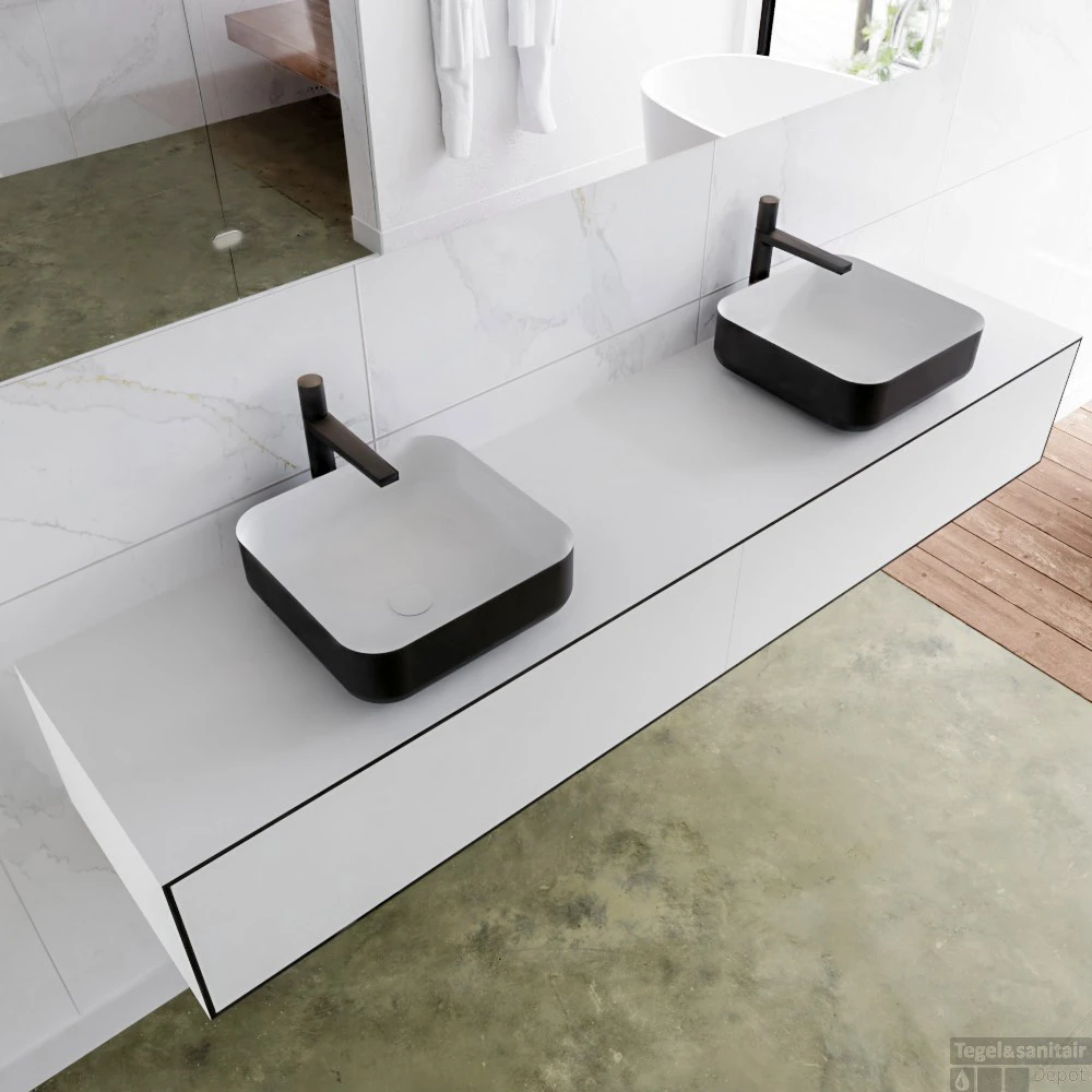 Badkamermeubelset Mondiaz LAGOM 190 cm Topblad met Dubbele Wastafel Solid Surface Opzetkom Binx met 2 Kraangaten Mat Zwart (2 laden)