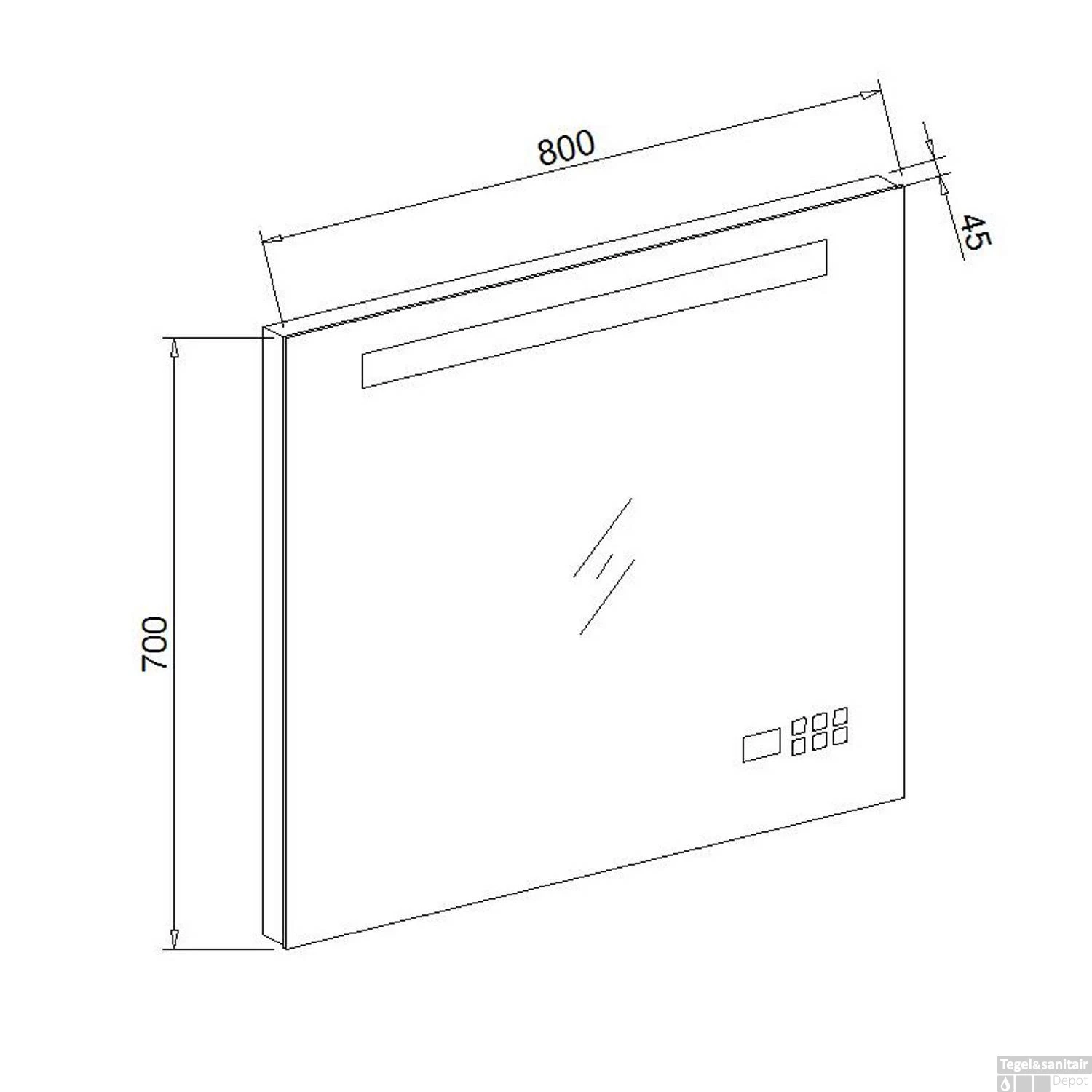 De spiegel is uitgerust met TL-verlichting aan de bovenzijde. Ook beschikt de spiegel over spiegelverwarming, waardoor condensvorming voorkomen wordt. De spiegel is is rondom afgewerkt in aluminium en heeft een glasdikte van 4,5 cm. De breedte bedraagt 80 cm, terwijl de spiegel een hoogte van 70 cm heeft.