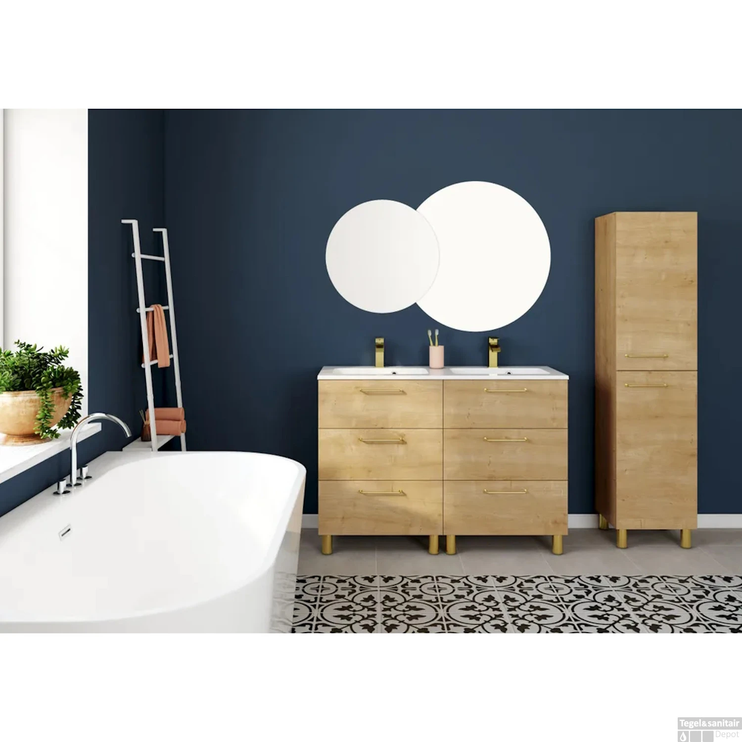 Deze badmeubelkast van Allibert uit de serie Kobo springt er echt tussenuit vanwege de gouden accenten die deze, toch wel nette en neutrale kast bevat. De kast hoort bij de serie Kobo en echt dan ook perfect met de andere badkamerartikelen van Kobo te combineren. Deze kast heeft 1 houten en 2 glazen legplanken aan de binnenkant en een diepte van 37 cm.