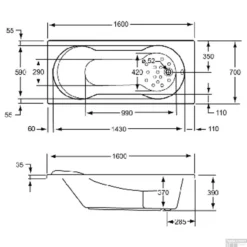 Dit is een eenpersoons bad en de afmetingen zijn 179×84.5×57.5 cm. Dit bad kan met een zijde tegen de muur geplaatst worden.