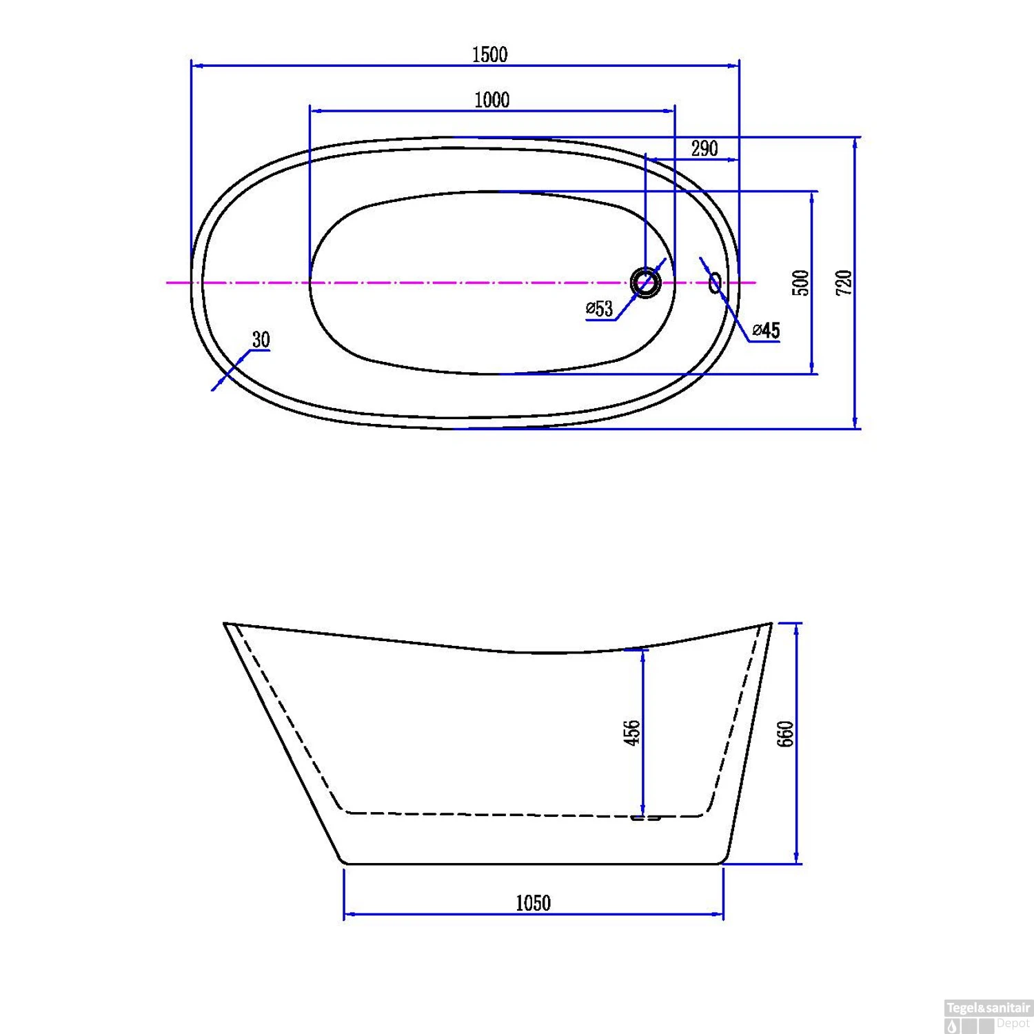 Specificaties BWS Vrijstaand Trapeze Ligbad Acryl 150×72 cm Wit (inclusief waste en overloop):