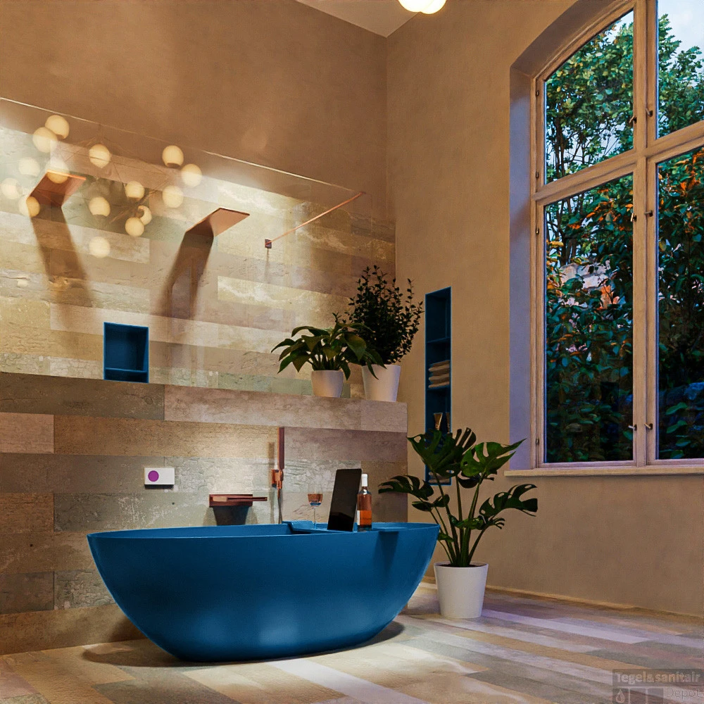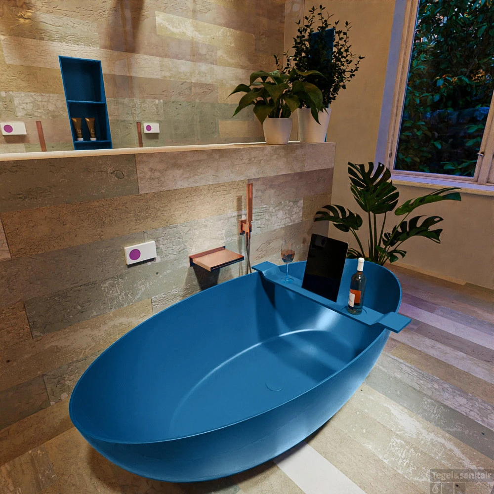 De ovale vorm kan goed vrijstaand geplaatst worden, maar zoals op de afbeelding staat het ook schitterend voor of bij een muur. Deze schitterende badkamer opstelling is gecombineerd met het badmeubel ALANen Solid Surface nissen. Zowel de wastafel als de meubels kunnen perfect matchen met het bad. Je kunt met een gerust hart kiezen voor kleur in de badkamer.