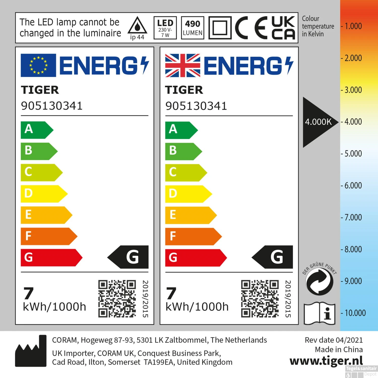 “De Tiger LED-lamp Aurel is een strakke, moderne designlamp. Door de breedte van de lamp is deze uitermate geschikt om boven de wastafelspiegel te hangen. De lamp kan op 2 manieren gemonteerd worden; zowel op het meubel als op de spiegel. De lamp is uitgevoerd in de kleur chroom. De lamp is voorzien van 7,2 watt LED verlichting met geïntegreerde transformator. De lichtkleur is 4000K.