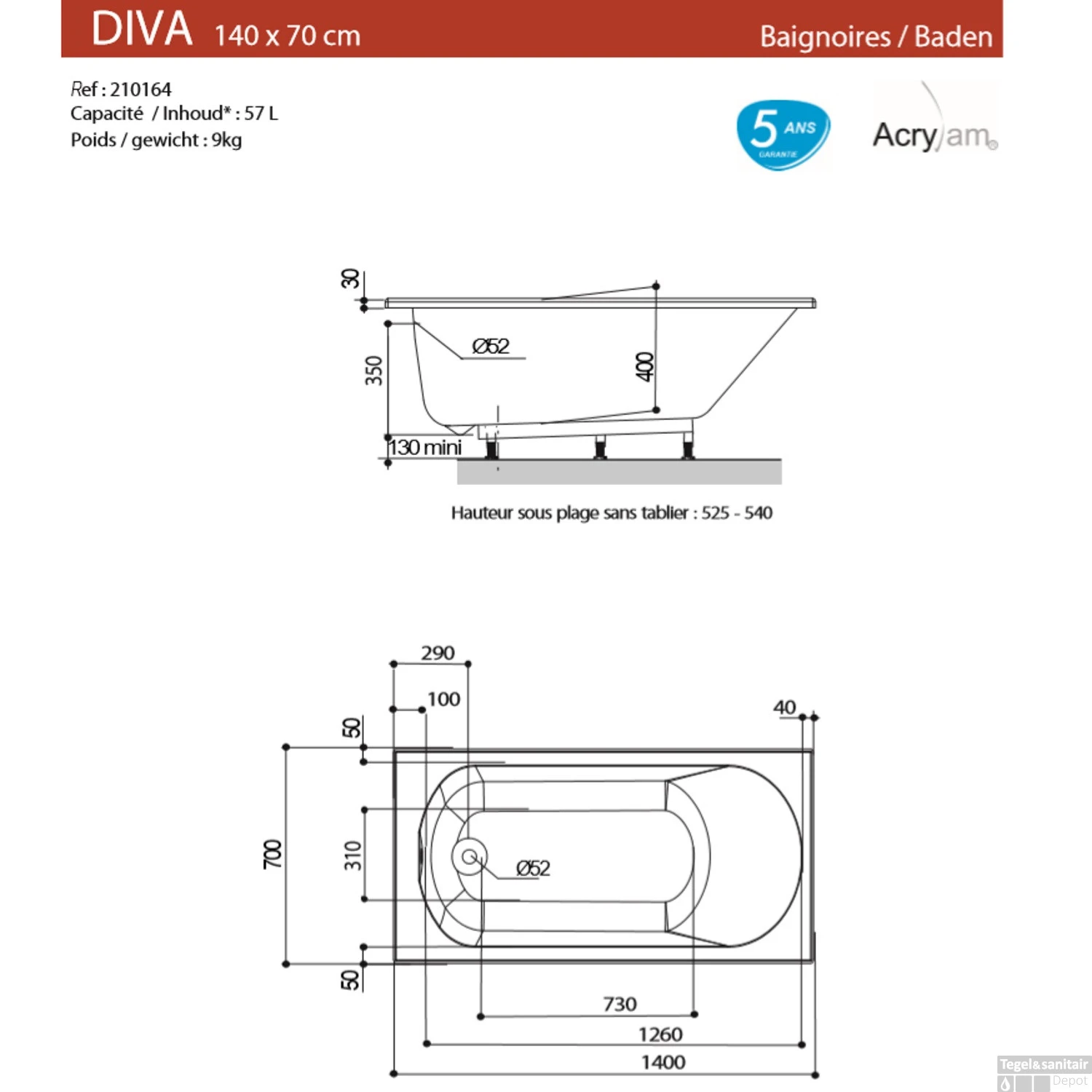 Het Ligbad van Allibert is een bad met strak uiterlijk. Het bad past echt bij elke badkamerruimte. De afvoer is gecentreerd in de lengte van het bad. Bij het bad zijn de poten inbegrepen. Het bad heeft een lengte van 140 cm, een breedte van 70 cm en een hoogte van 52 cm. Het materiaal wat gebruikt is voor het bad is acryl. Het materiaal acryl heeft het voordeel dat bacteriën en vuil zich nauwelijks hechten.