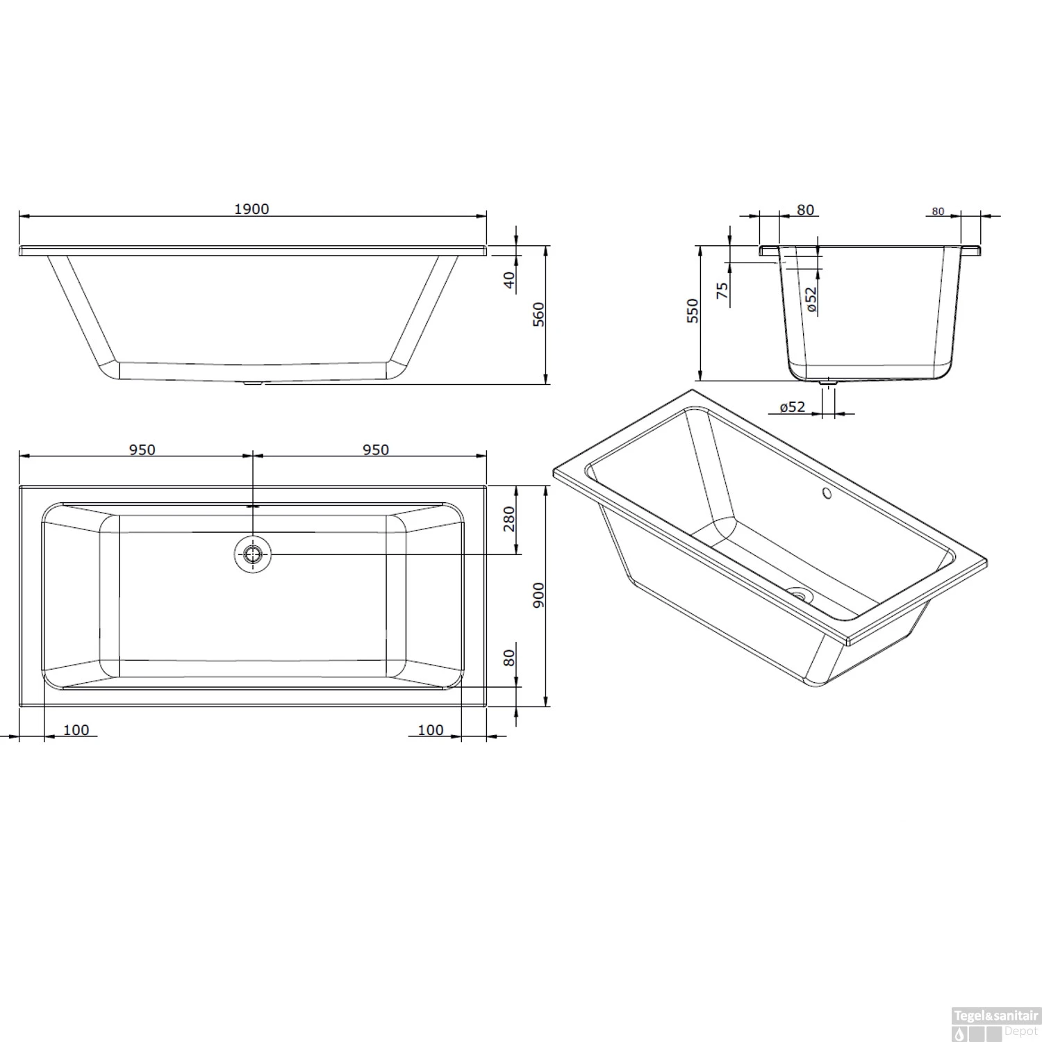 Met dit stijlvolle, ruime bad kunt u altijd genieten van een warm bad na een lange dag. Met zijn afmetingen van 190×90 cm is er plaats genoeg om erin te liggen. Het bad is 56 cm hoog. De rand heeft een dikte van 8 cm. De afvoer heeft een diameter van 5,2 cm. Dit bad wordt geleverd exclusief afvoer en badpoten.