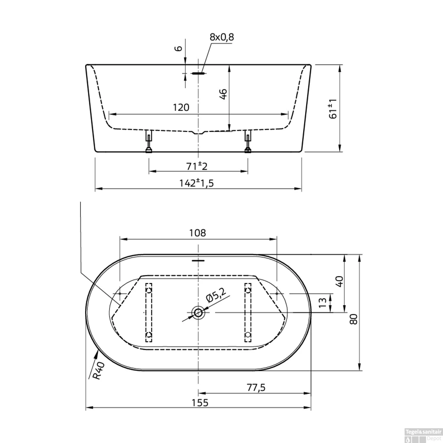 Specificaties Ligbad Xenz Friso Vrijstaand 155×80 cm Glanzend Wit: