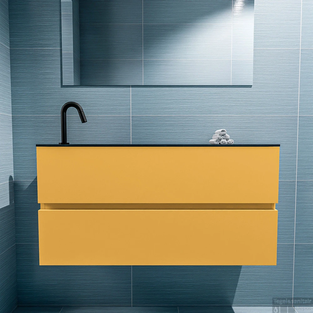 Geef jouw toilet een upgrade met de populaire toiletmeubel serie ADA! Hier zie je de vrijhangende onderkast ADA van 100cm breed met 2 lades in de kleur ocher en een solid surface wastafel model LEX in de kleur Urban. De positie van de spoelbak is links 1 kraangat. In deze toiletmeubel serie hebben wij al meer dan 600 variaties samengesteld! Daarnaast is maatwerk mogelijk.