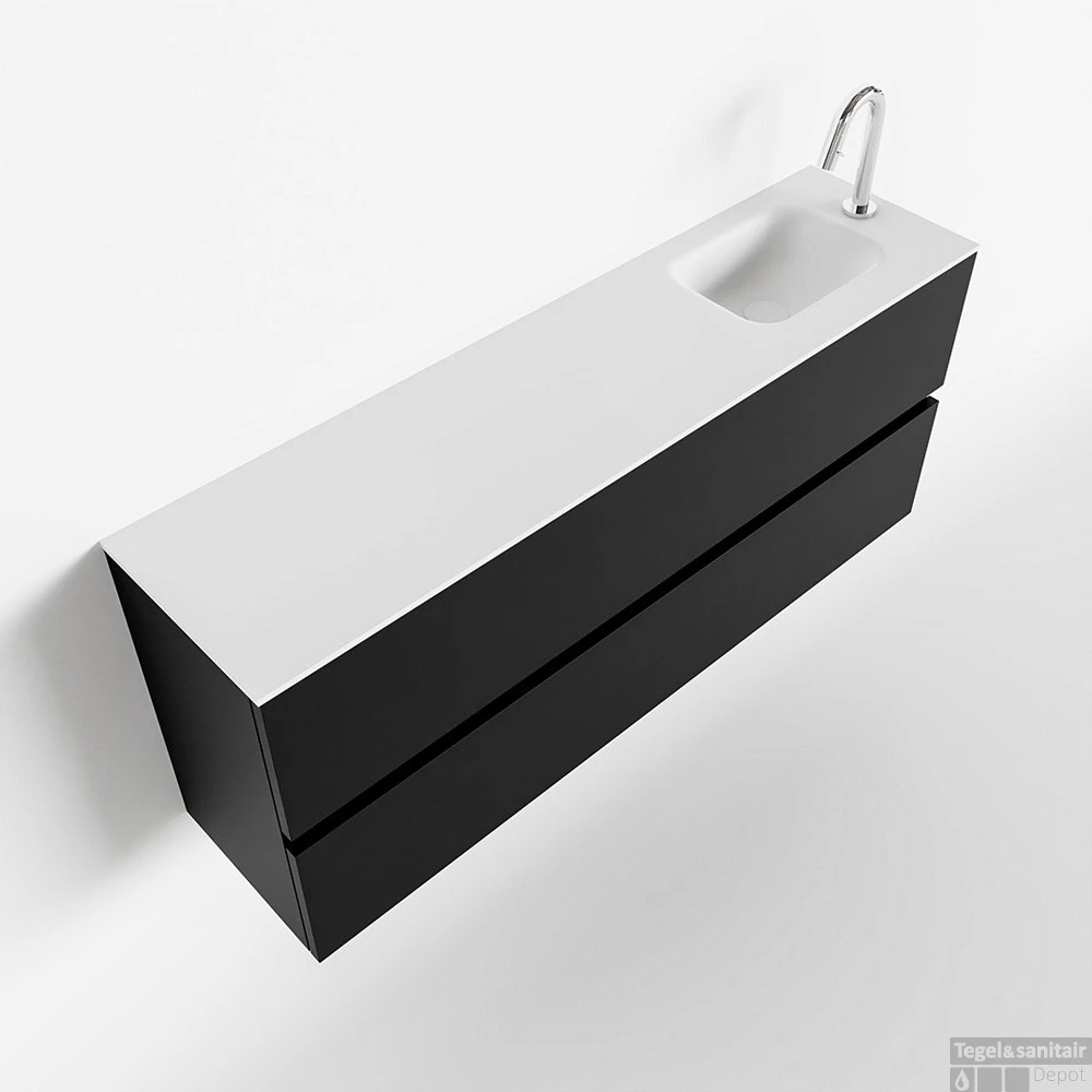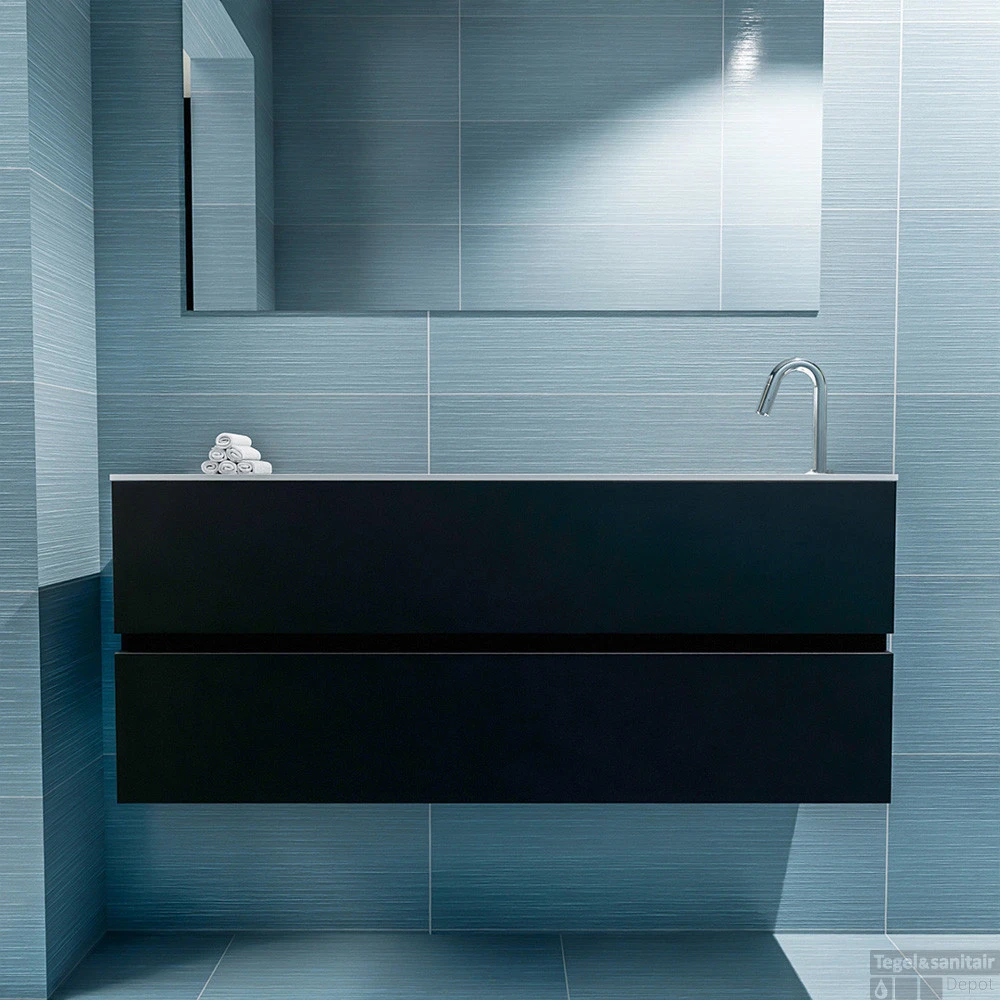 Geef jouw toilet een upgrade met de populaire toiletmeubel serie ADA! Hier zie je de vrijhangende onderkast ADA van 120cm breed met 2 lades in de kleur urban en een solid surface wastafel model LEX in de kleur Talc. De positie van de spoelbak is rechts 1 kraangat. In deze toiletmeubel serie hebben wij al meer dan 600 variaties samengesteld! Daarnaast is maatwerk mogelijk.