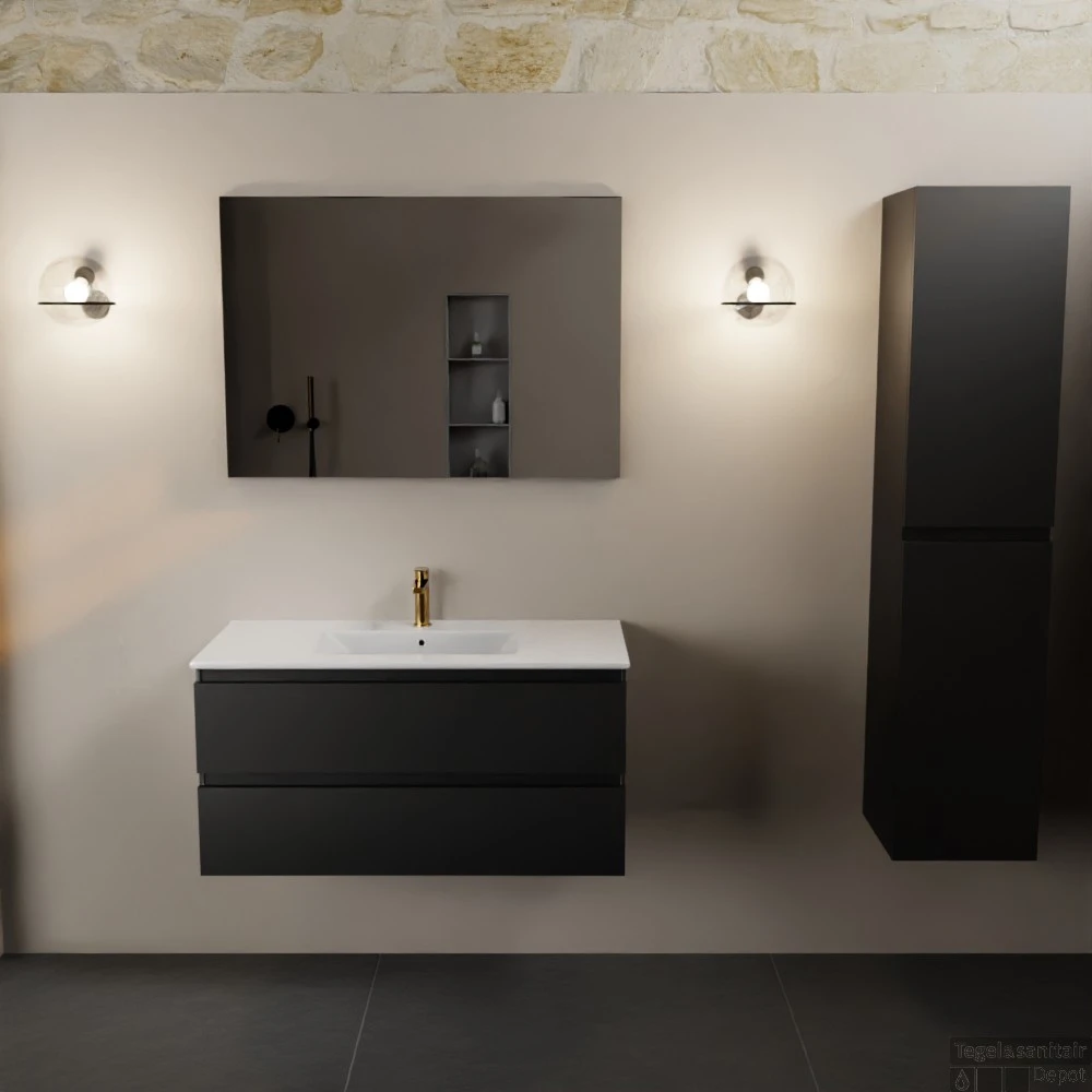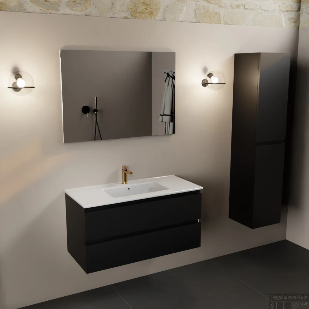 Met badkamermeubels set AIVY heeft u eindeloos veel opties om uw badkamer helemaal naar uw wensen in te vullen. En kunt u van uw badkamer een “formidabele” badkamer maken waar u heerlijk kunt genieten. U ziet hier AIVY 100cm badkamermeubel in de kleur Urban met 2 lades. De AIVY -onderkasten zijn verkrijgbaar in 4 kleuren. De 2 prachtige houttinten melamines Mocha en Chai met een voelbare houtstructuur en 2 effen gespoten kleuren MDF mat wit en matzwart. De AIVY wastafels zijn te krijgen in 2 kleuren Solid Surface, matzwart en mat wit, met de keuze wel of geen kraangaten en DENIA keramisch wit glanzende wastafel is standaard met kraangaten.