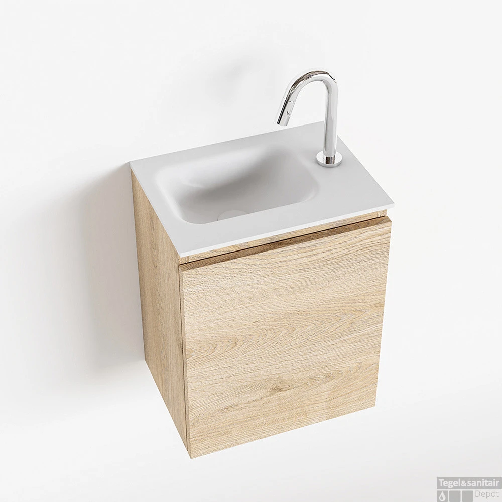 Een mooie combinatie van elegant en rustiek krijg je met het toiletmeubel OLAN! Wat je hier ziet is de vrijhangende onderkast OLAN in 40cm breed met 1 lade in de kleur washed_oak en een solid surface wastafel model LEX in de kleur talc. De positie van de spoelbak is links 1 kraangat. In deze toiletmeubel serie hebben wij al meer dan 680 variaties samengesteld! Daarnaast is maatwerk mogelijk.