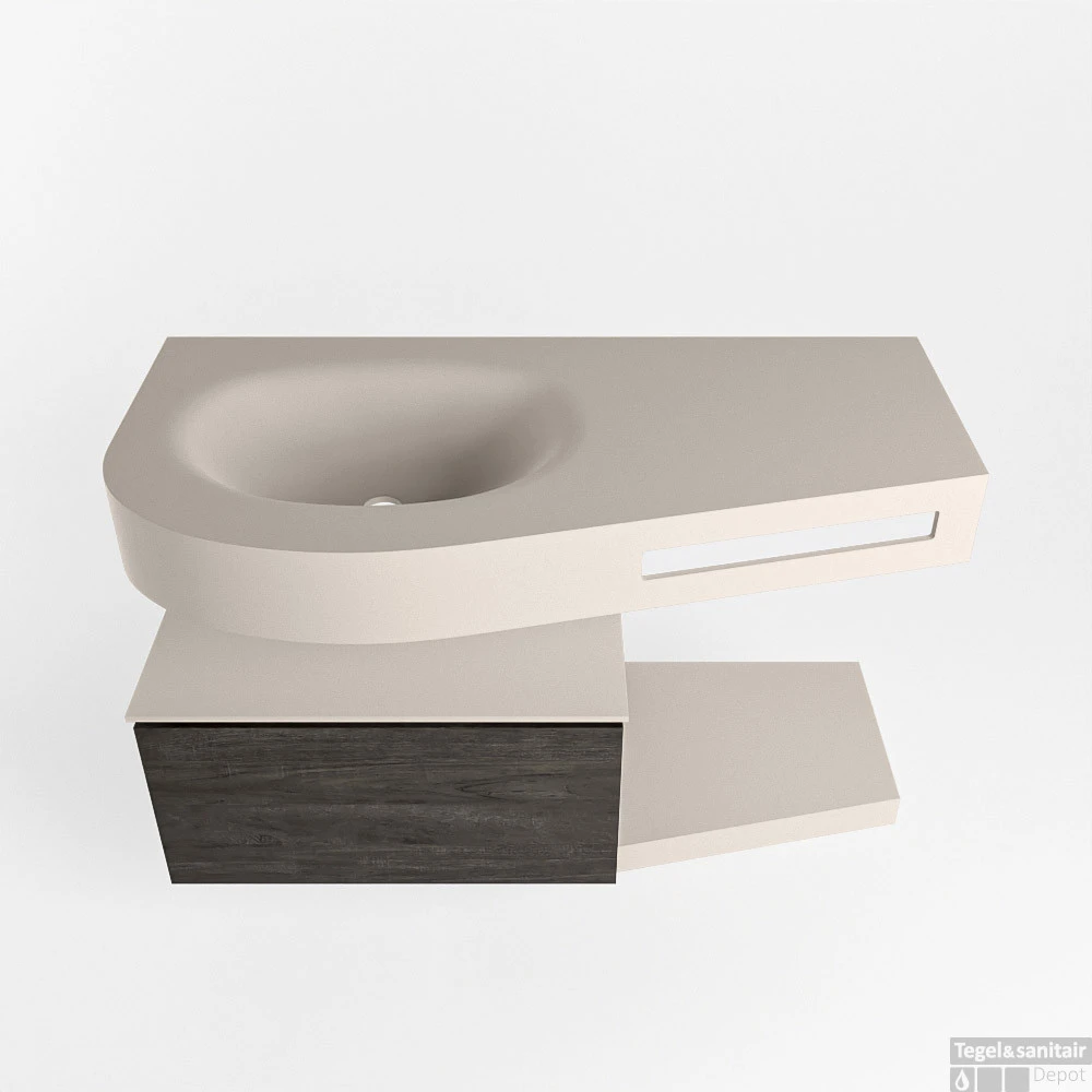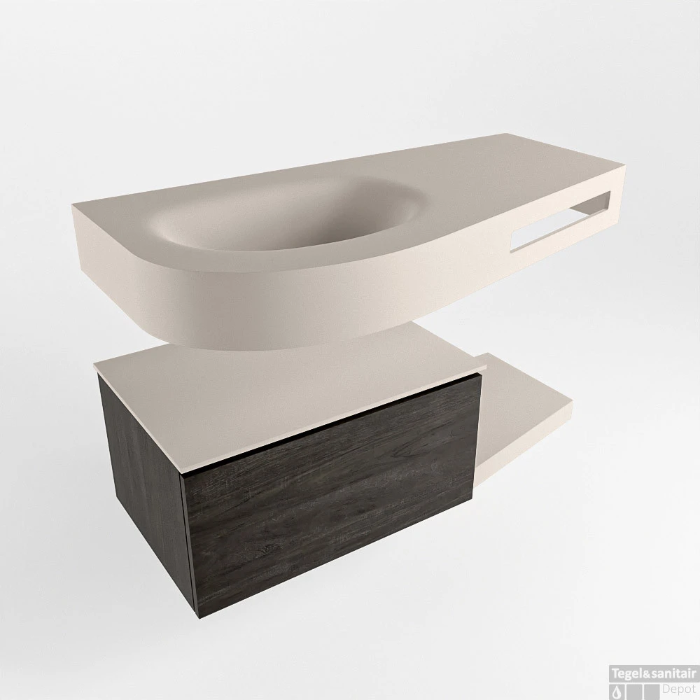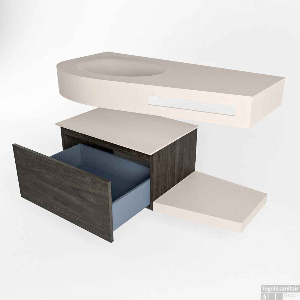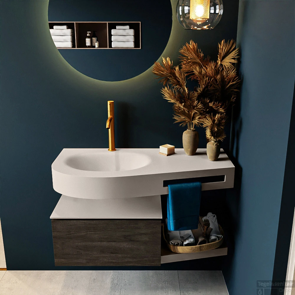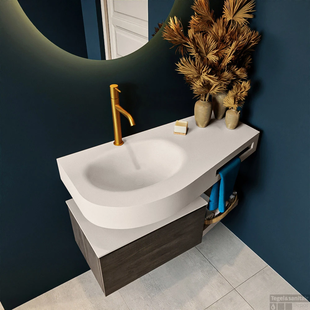 Deze set staat niet alleen mooi in een luxe hotelkamer maar kan ook een fantastische blikvanger zijn in uw badkamer. De speciale vorm van de wastafel DULCET en de geïntegreerde handdoek houder zorgen ervoor dat ook in de kleinere badkamer je kunt genieten van deze hotel chique uitstraling. De badmeubel in deze afbeeldingen is de RIVA 100cm badkamermeubel met onderkast in de kleur Dark_Brown. De RIVA heeft een vrij hangende onderkast met 1 lade waarin voldoende ruimte is voor uw badkamer spulletjes. Het solid surface planchet heeft dezelfde toelopende vorm als de wastafel. Het planchet geeft u ruimte om mooie badkamer producten te laten zien.