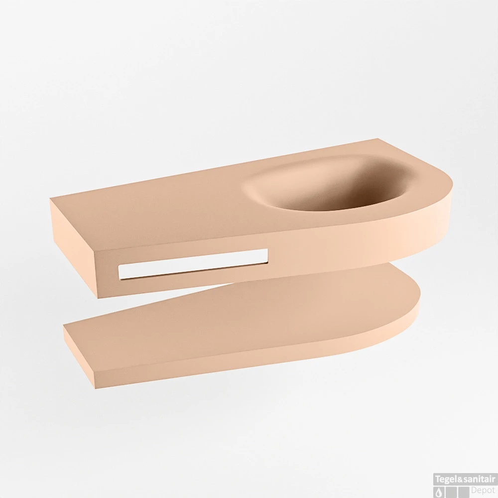 Deze set staat niet alleen mooi in een luxe hotelkamer maar kan ook een fantastische blikvanger zijn in uw badkamer. De speciale vorm van de wastafel DULCET en de geïntegreerde handdoek houder zorgen ervoor dat ook in de kleinere badkamer je kunt genieten van deze hotel chique uitstraling. De badmeubel in deze afbeeldingen is de RIVA 100cm badkamermeubel met onderkast in de kleur Rosee. De RIVA heeft een vrij hangende onderkast met 1 lade waarin voldoende ruimte is voor uw badkamer spulletjes. Het solid surface planchet heeft dezelfde toelopende vorm als de wastafel. Het planchet geeft u ruimte om mooie badkamer producten te laten zien.