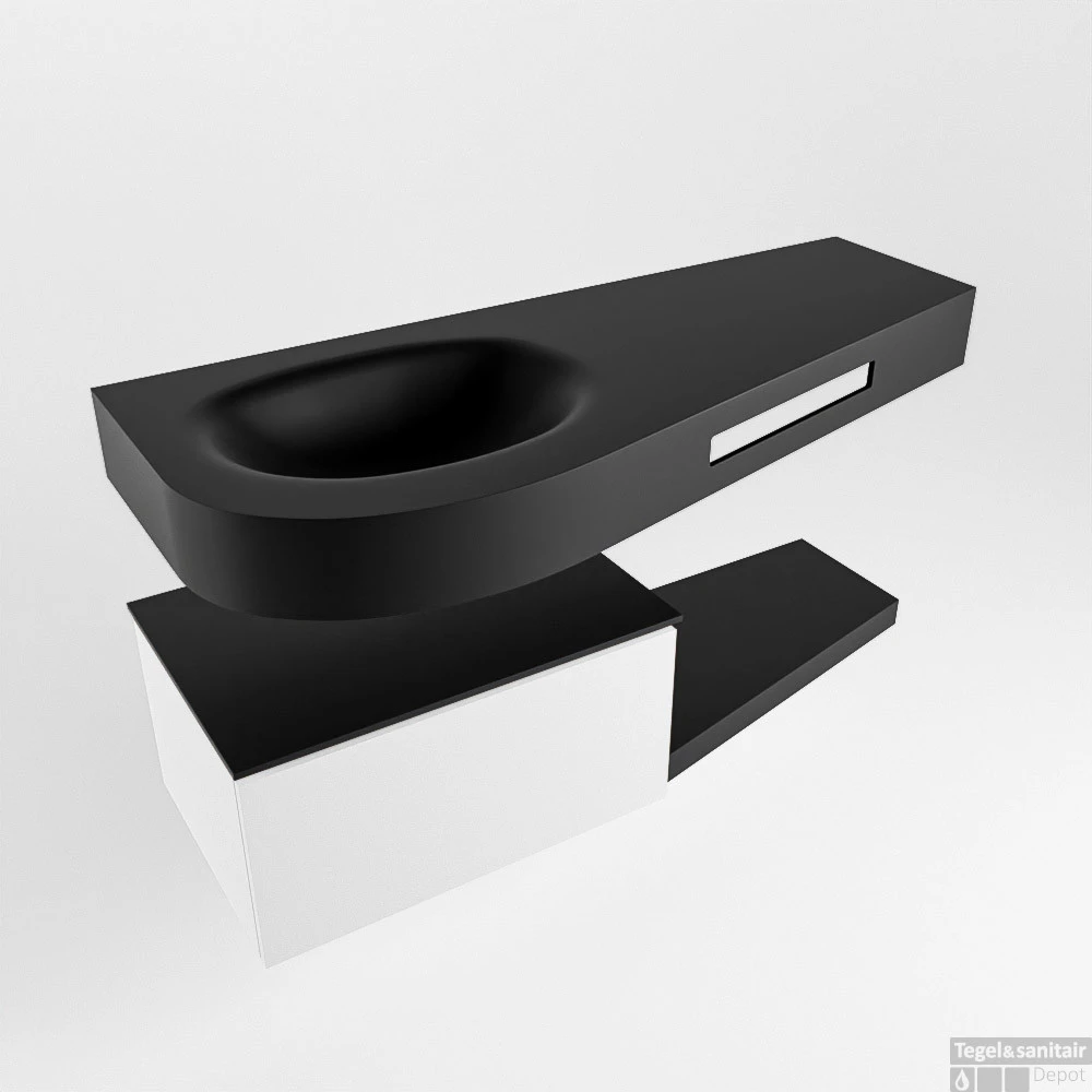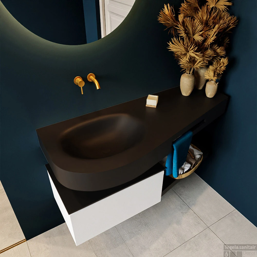 Deze set staat niet alleen mooi in een luxe hotelkamer maar kan ook een fantastische blikvanger zijn in uw badkamer. De speciale vorm van de wastafel DULCET en de geïntegreerde handdoek houder zorgen ervoor dat ook in de kleinere badkamer je kunt genieten van deze hotel chique uitstraling. De badmeubel in deze afbeeldingen is de RIVA 120cm badkamermeubel met onderkast in de kleur Talc. De RIVA heeft een vrij hangende onderkast met 1 lade waarin voldoende ruimte is voor uw badkamer spulletjes. Het solid surface planchet heeft dezelfde toelopende vorm als de wastafel. Het planchet geeft u ruimte om mooie badkamer producten te laten zien.