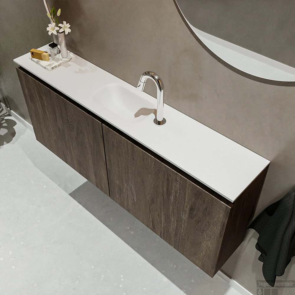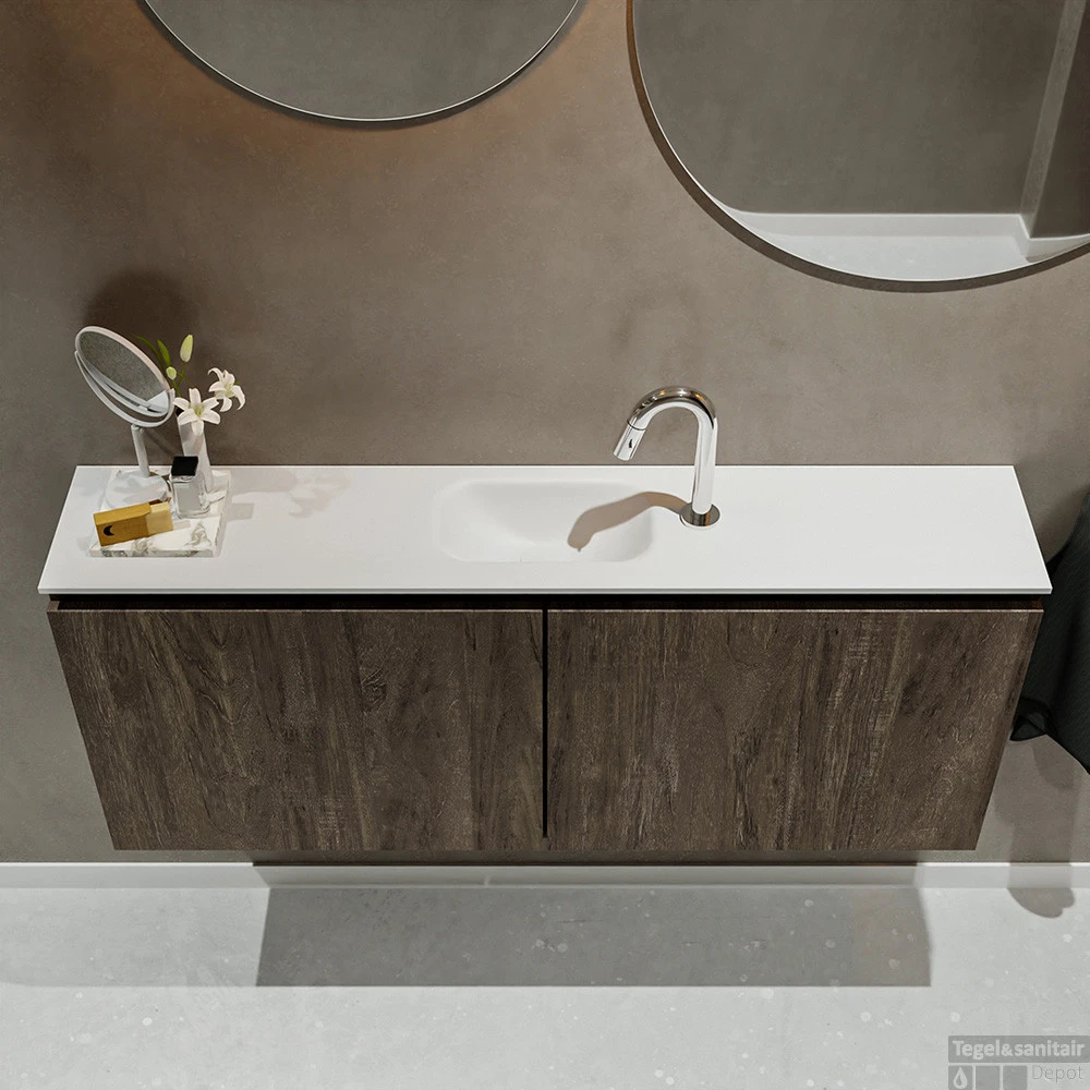 Moderniseer jouw toilet met dit toiletmeubel TURE! Het gaat hier om de vrijhangende onderkast TURE in 120cm breed met 2 deuren in de kleur dark brown en een solid surface wastafel model EDEN in de kleur talc. De positie van de spoelbak is midden 1 kraangat. In deze toiletmeubel serie hebben wij al meer dan 680 variaties samengesteld! Daarnaast is maatwerk mogelijk.