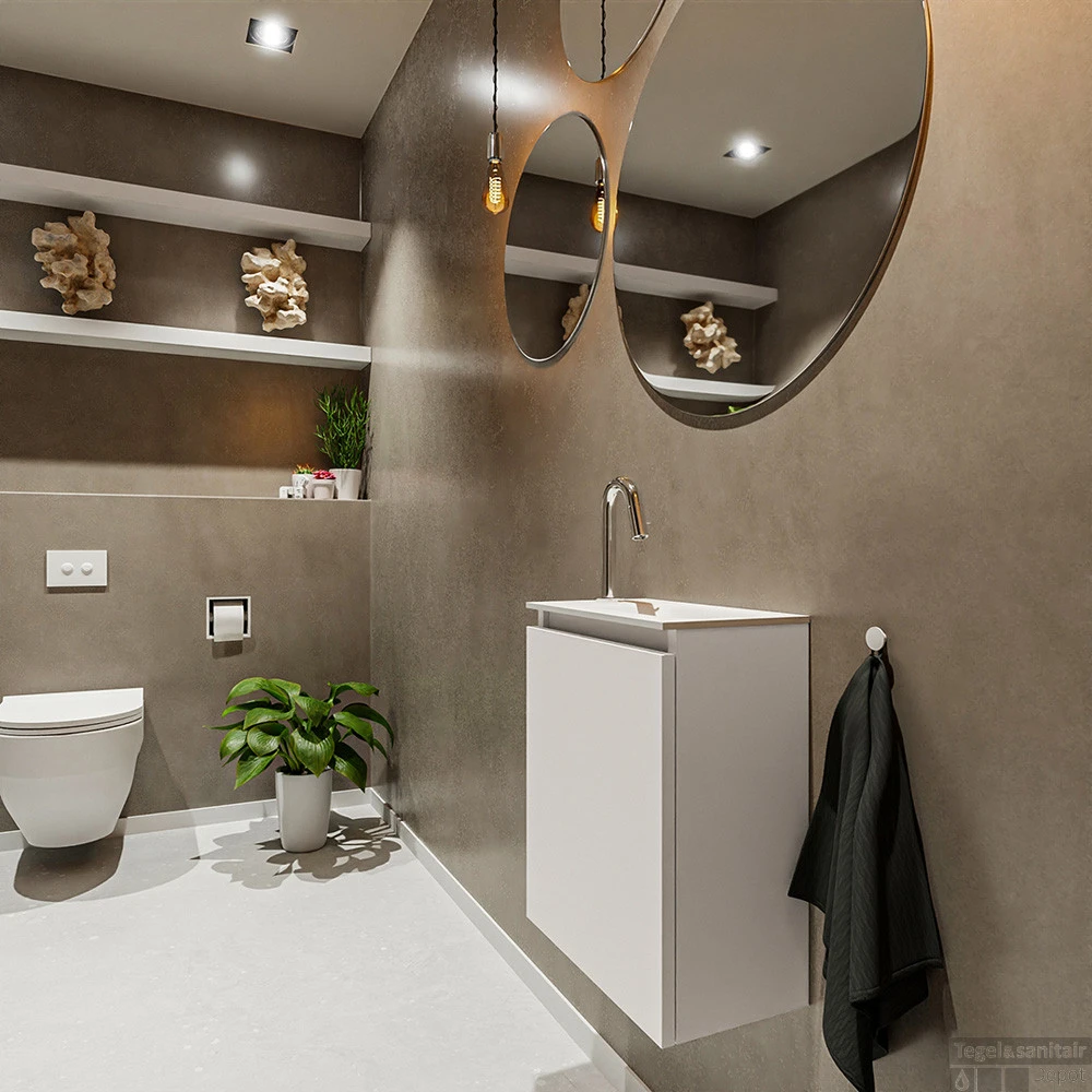 Moderniseer jouw toilet met dit toiletmeubel TURE! Het gaat hier om de vrijhangende onderkast TURE in 40cm breed met 1 deur in de kleur linen en een solid surface wastafel model EDEN in de kleur talc. De positie van de spoelbak is rechts 1 kraangat. In deze toiletmeubel serie hebben wij al meer dan 680 variaties samengesteld! Daarnaast is maatwerk mogelijk.