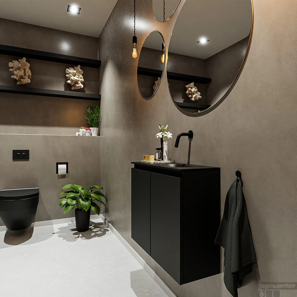 Moderniseer jouw toilet met dit toiletmeubel TURE! Het gaat hier om de vrijhangende onderkast TURE in 60cm breed met 2 deuren in de kleur urban en een solid surface wastafel model EDEN in de kleur urban. De positie van de spoelbak is rechts zonder kraangat. In deze toiletmeubel serie hebben wij al meer dan 680 variaties samengesteld! Daarnaast is maatwerk mogelijk.