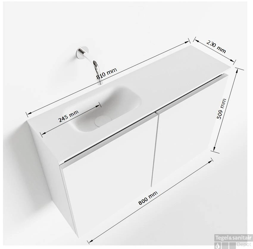Moderniseer jouw toilet met dit toiletmeubel TURE! Het gaat hier om de vrijhangende onderkast TURE in 80cm breed met 2 deuren in de kleur talc en een solid surface wastafel model EDEN in de kleur talc. De positie van de spoelbak is links zonder kraangat. In deze toiletmeubel serie hebben wij al meer dan 680 variaties samengesteld! Daarnaast is maatwerk mogelijk.
