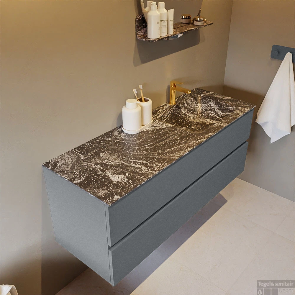 De buitengewone mooie badmeubel set VICA DLUX is een schitterend pronkstuk in uw badkamer. De gemarmerde Solid Surface wastafel van CORIAN heeft een fraaie en tijdloze uitstraling. Door de zachte en natuurlijke vorm van de wastafel, gecombineerd met de tijdloze en prachtige badmeubel onderkast past de VICA-DLUX goed bij de diverse stijlen badkamers. Om uw badkamer compleet te af te stijlen hebben wij ook de nissen en spiegelhouders in dezelfde kleur als de wastafel. Zoals de nissen en spiegel planchetten. De serie VICA DLUX bestaat uit de 2 of 4 laden onderkast VICA gecombineerd met een CORIAN Solid Surface wastafel met marmer structuur. De Solid Surface CORIAN wastafel is in 5 marmer looks verkrijgbaar. Met deze badkamermeubel set heeft u wel die mooie marmeren uitstraling maar tevens ook het gemak en de hygiëne van Solid Surface.
