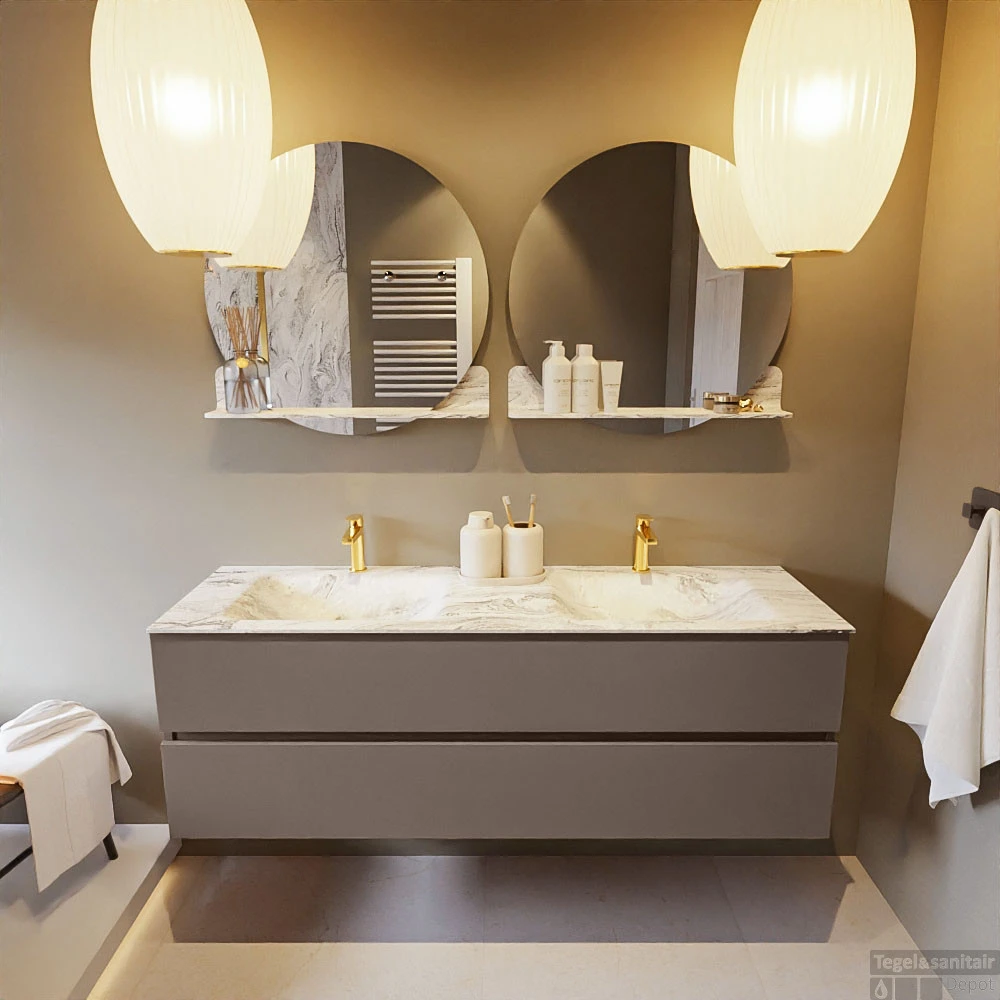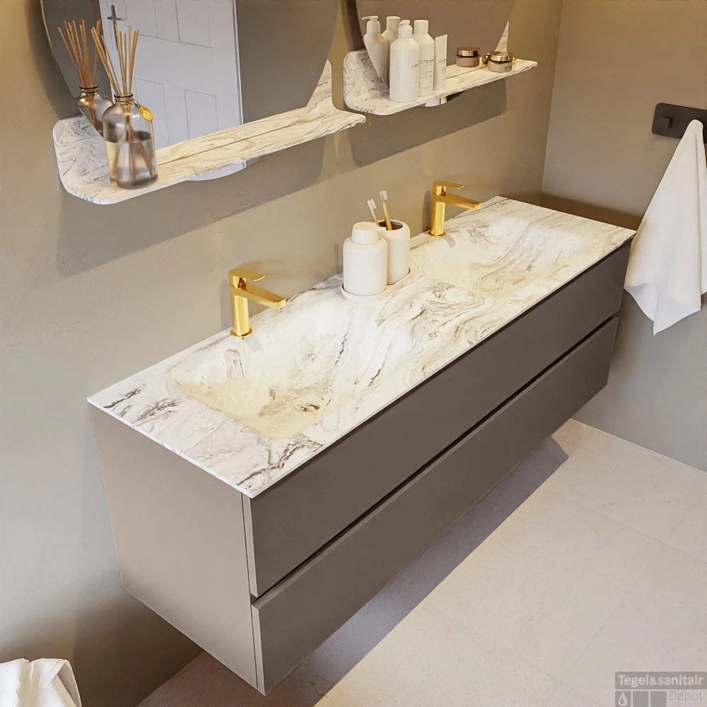 De buitengewone mooie badmeubel set VICA DLUX is een schitterend pronkstuk in uw badkamer. De gemarmerde Solid Surface wastafel van CORIAN heeft een fraaie en tijdloze uitstraling. Door de zachte en natuurlijke vorm van de wastafel, gecombineerd met de tijdloze en prachtige badmeubel onderkast past de VICA-DLUX goed bij de diverse stijlen badkamers. Om uw badkamer compleet te af te stijlen hebben wij ook de nissen en spiegelhouders in dezelfde kleur als de wastafel. Zoals de nissen en spiegel planchetten. De serie VICA DLUX bestaat uit de 2 of 4 laden onderkast VICA gecombineerd met een CORIAN Solid Surface wastafel met marmer structuur. De Solid Surface CORIAN wastafel is in 5 marmer looks verkrijgbaar. Met deze badkamermeubel set heeft u wel die mooie marmeren uitstraling maar tevens ook het gemak en de hygiëne van Solid Surface.