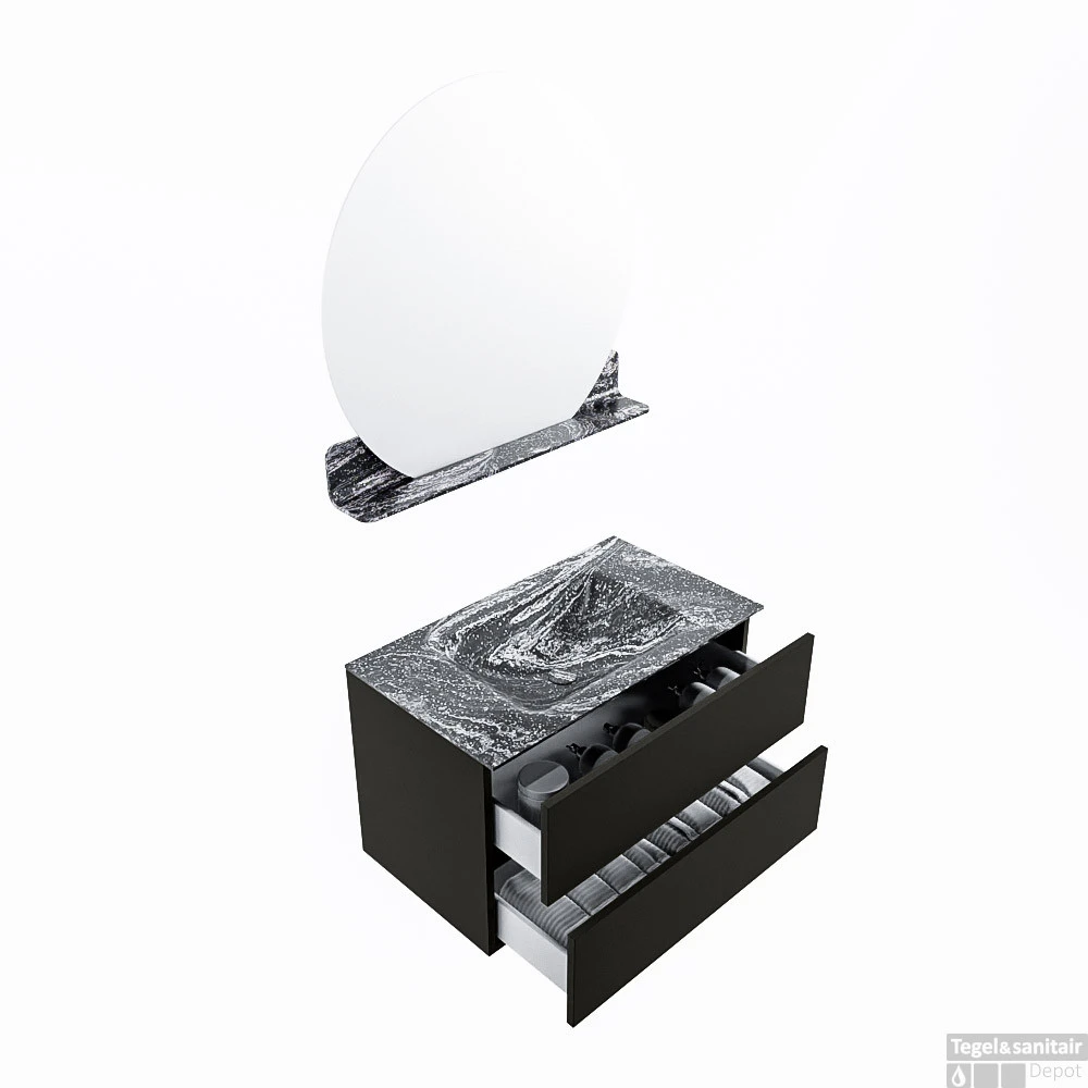 De buitengewone mooie badmeubel set VICA DLUX is een schitterend pronkstuk in uw badkamer. De gemarmerde Solid Surface wastafel van CORIAN heeft een fraaie en tijdloze uitstraling. Door de zachte en natuurlijke vorm van de wastafel, gecombineerd met de tijdloze en prachtige badmeubel onderkast past de VICA-DLUX goed bij de diverse stijlen badkamers. Om uw badkamer compleet te af te stijlen hebben wij ook de nissen en spiegelhouders in dezelfde kleur als de wastafel. Zoals de nissen en spiegel planchetten. De serie VICA DLUX bestaat uit de 2 of 4 laden onderkast VICA gecombineerd met een CORIAN Solid Surface wastafel met marmer structuur. De Solid Surface CORIAN wastafel is in 5 marmer looks verkrijgbaar. Met deze badkamermeubel set heeft u wel die mooie marmeren uitstraling maar tevens ook het gemak en de hygiëne van Solid Surface.
