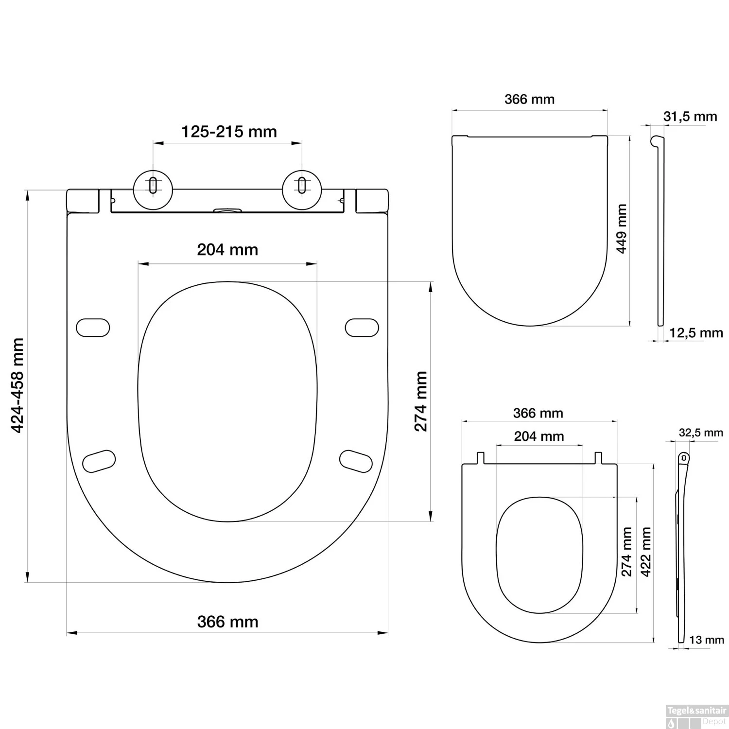 De toiletbril is 3,8 cm hoog, 36,6 cm breed en 44,9 cm diep. De H.O.H is verstelbaar tussen 12,5 en 21,5 cm. Wordt geleverd inclusief toiletbril.