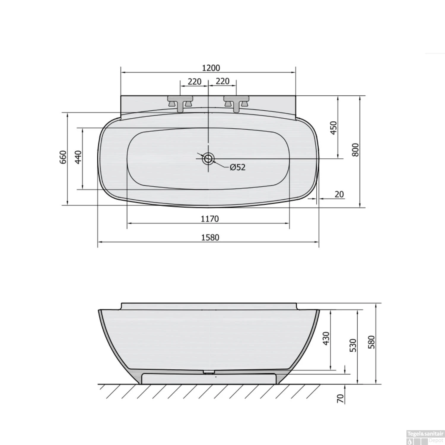 Het bad wordt geleverd zonder overloopopening. De sifon moet gedeeltelijk in de vloer worden ingebed.