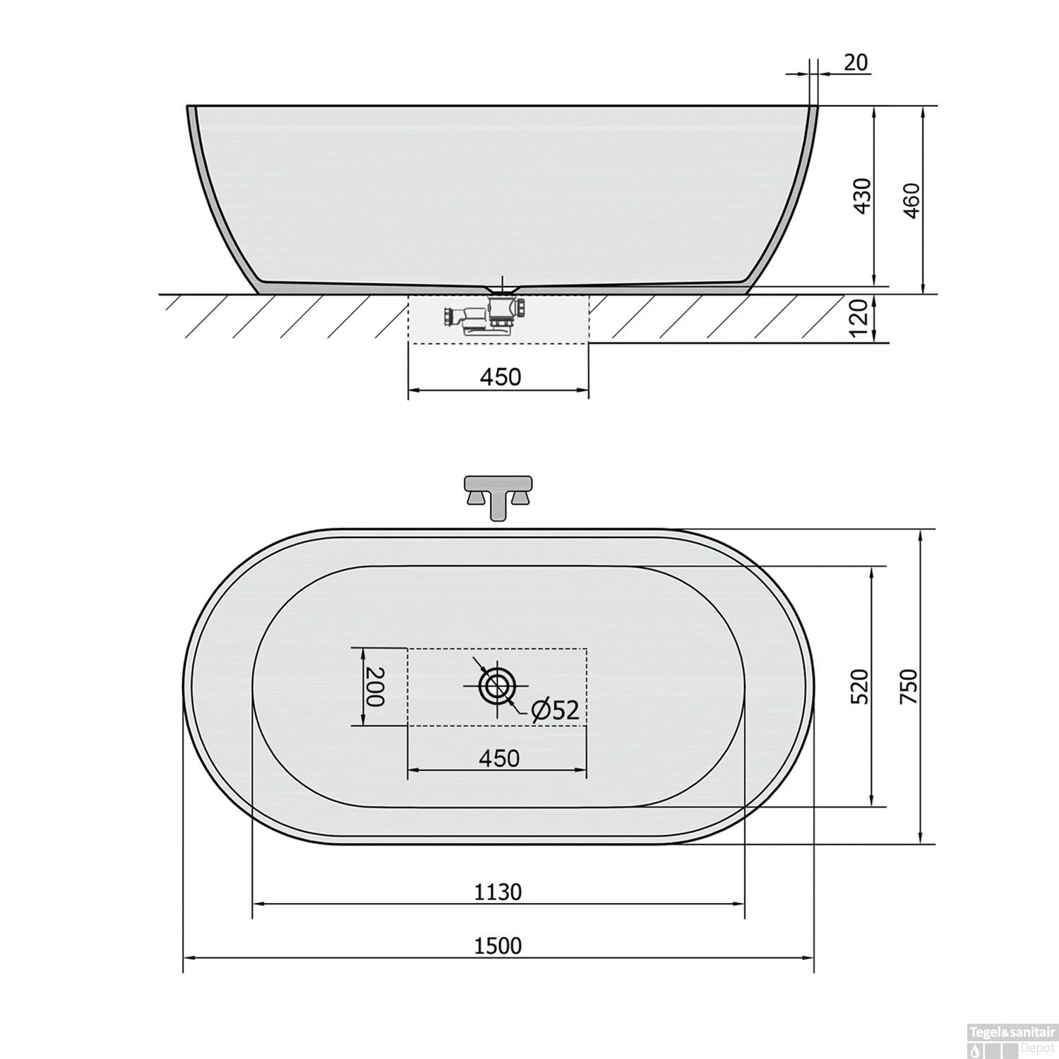Specificaties Vrijstaand Bad Gegoten Marmer 150x75x46 cm Wit Sapho Reduta: