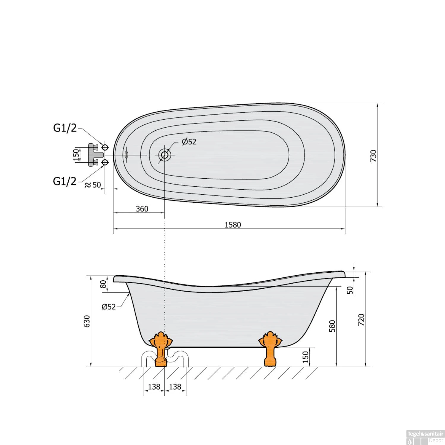 Specificaties Vrijstaand Bad 158x73x72 cm Wit met Leeuwenpoten Sapho Retro: