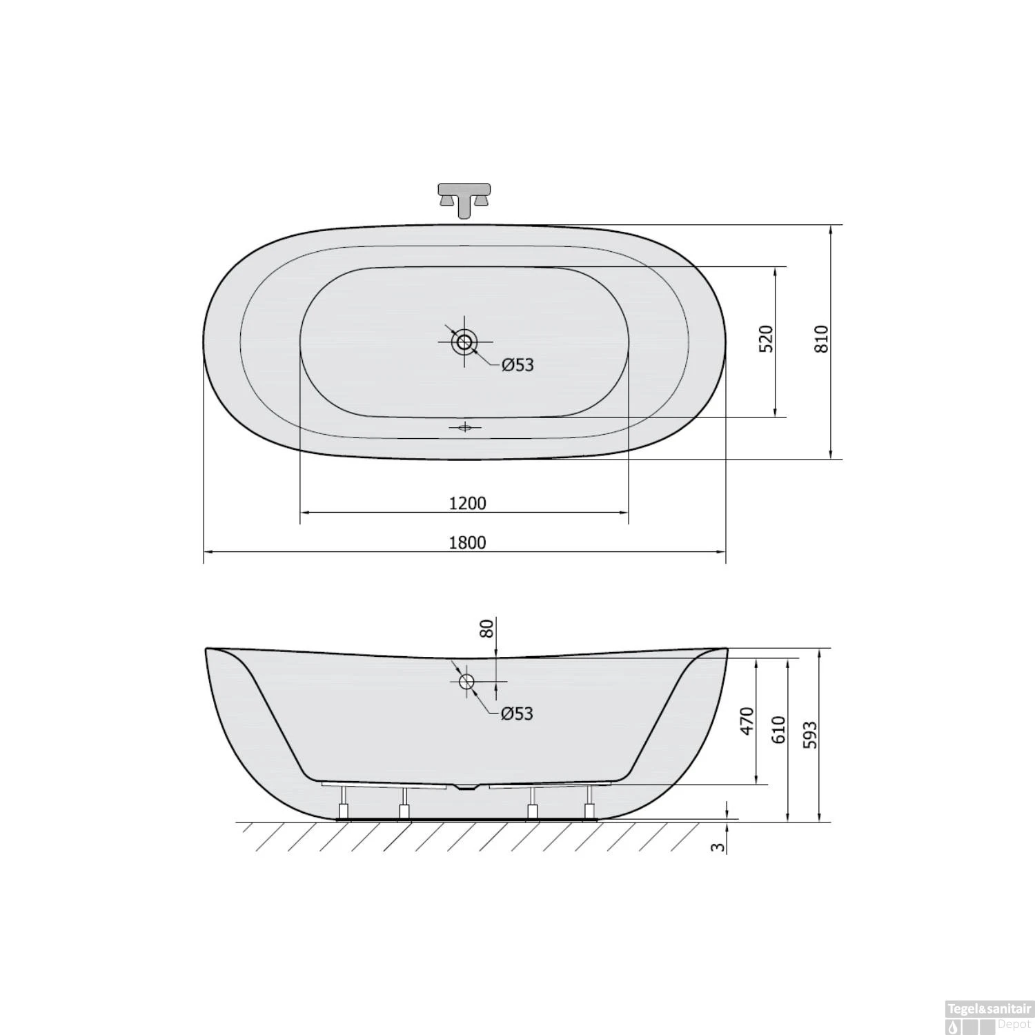 Het bad is 180 cm lang en 81 cm diep en heeft een hoogte van 58 cm, genoeg om gezellig met zijn tweeën in te zitten. De afvoer zal niet in de weg zitten want die zit netjes in het midden.Â
