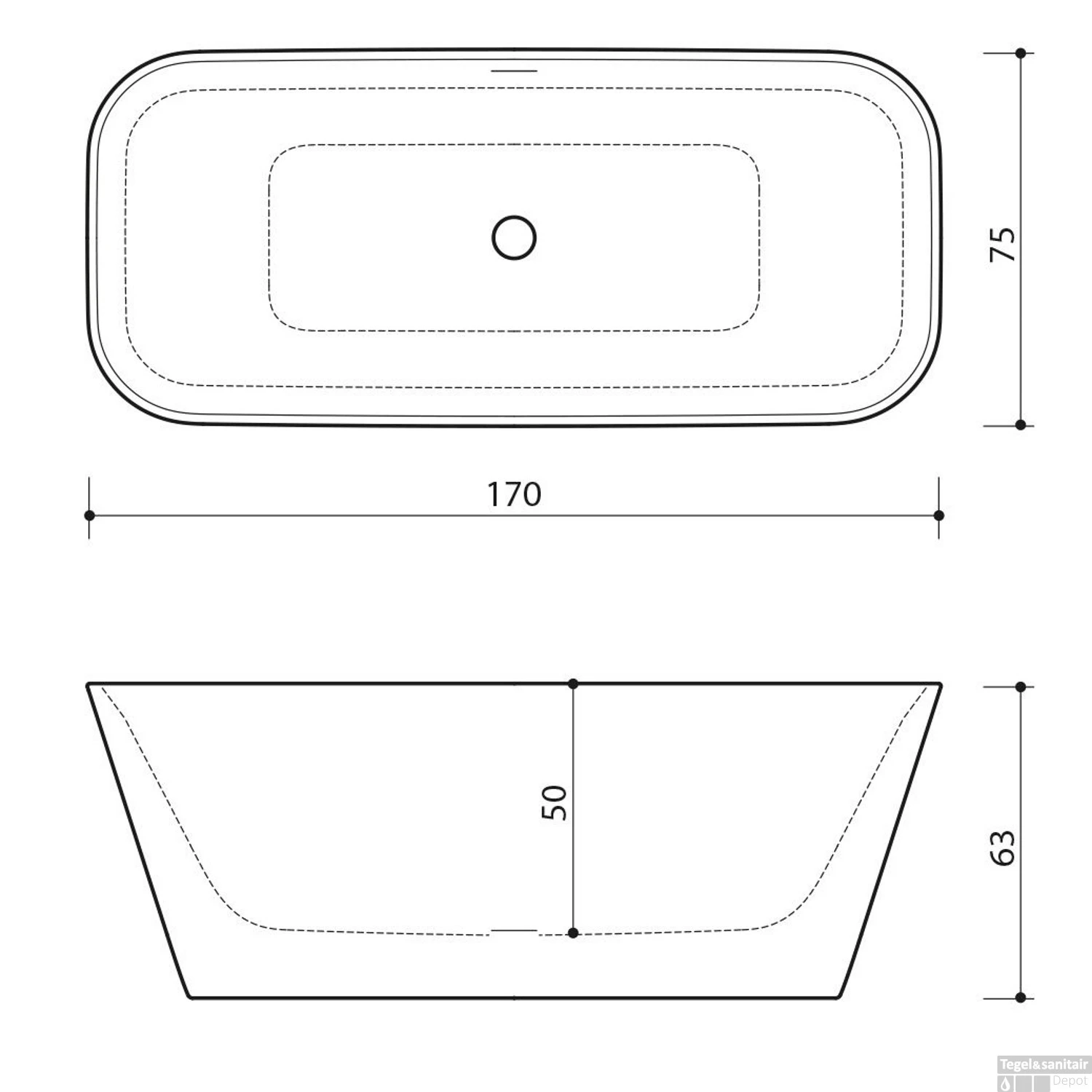 Het bad heeft een lengte van 170 cm, een hoogte van 63 cm en is 75 cm breed. De binnenmaat is 110×40 cm. Inclusief badpoten en overloop.