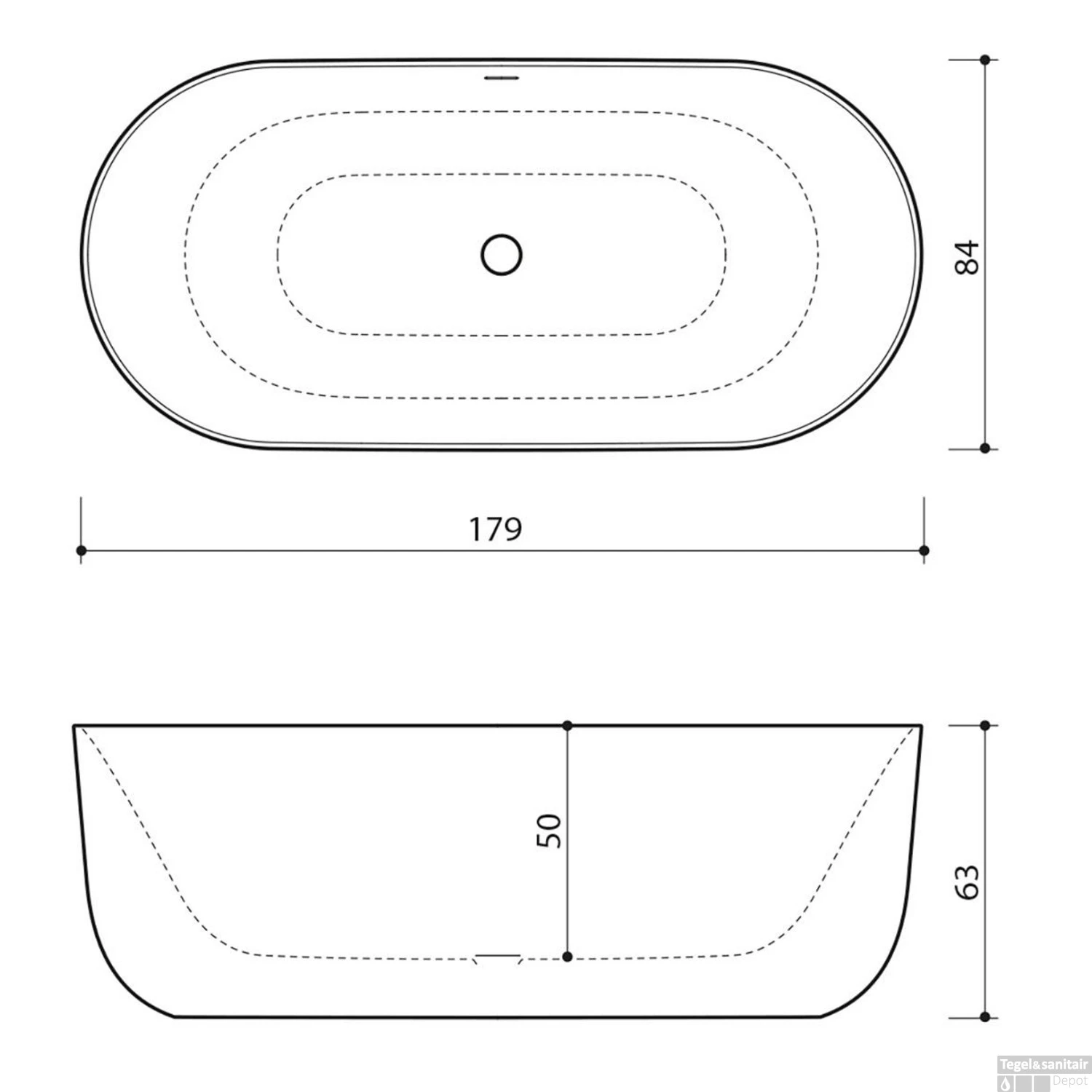 Het bad heeft een lengte van 179 cm, een hoogte van 64 cm en is 84 cm breed. De binnenmaat is 110×40 cm. Inclusief badpoten en overloop.