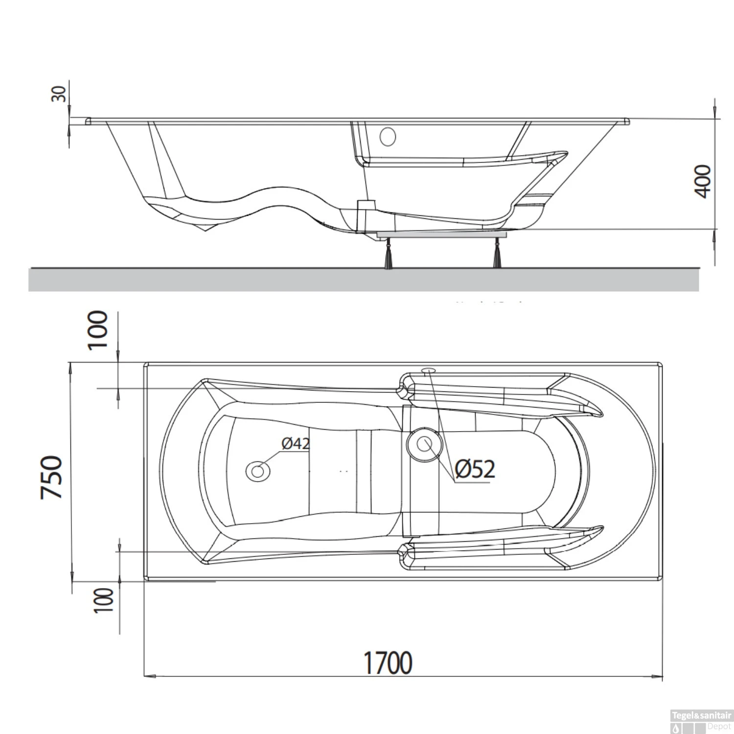 Het bad heeft een zitdiepte van 40 cm, een lengte van 170 cm, een breedte van 75 cm en een hoogte van standaard 40 cm wat verhoogd kan worden door de verstelbare badpoten.